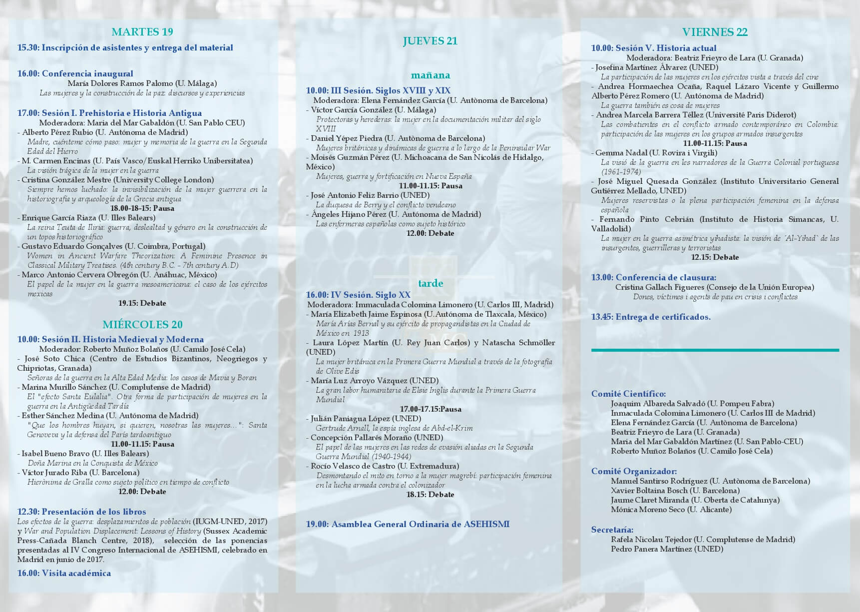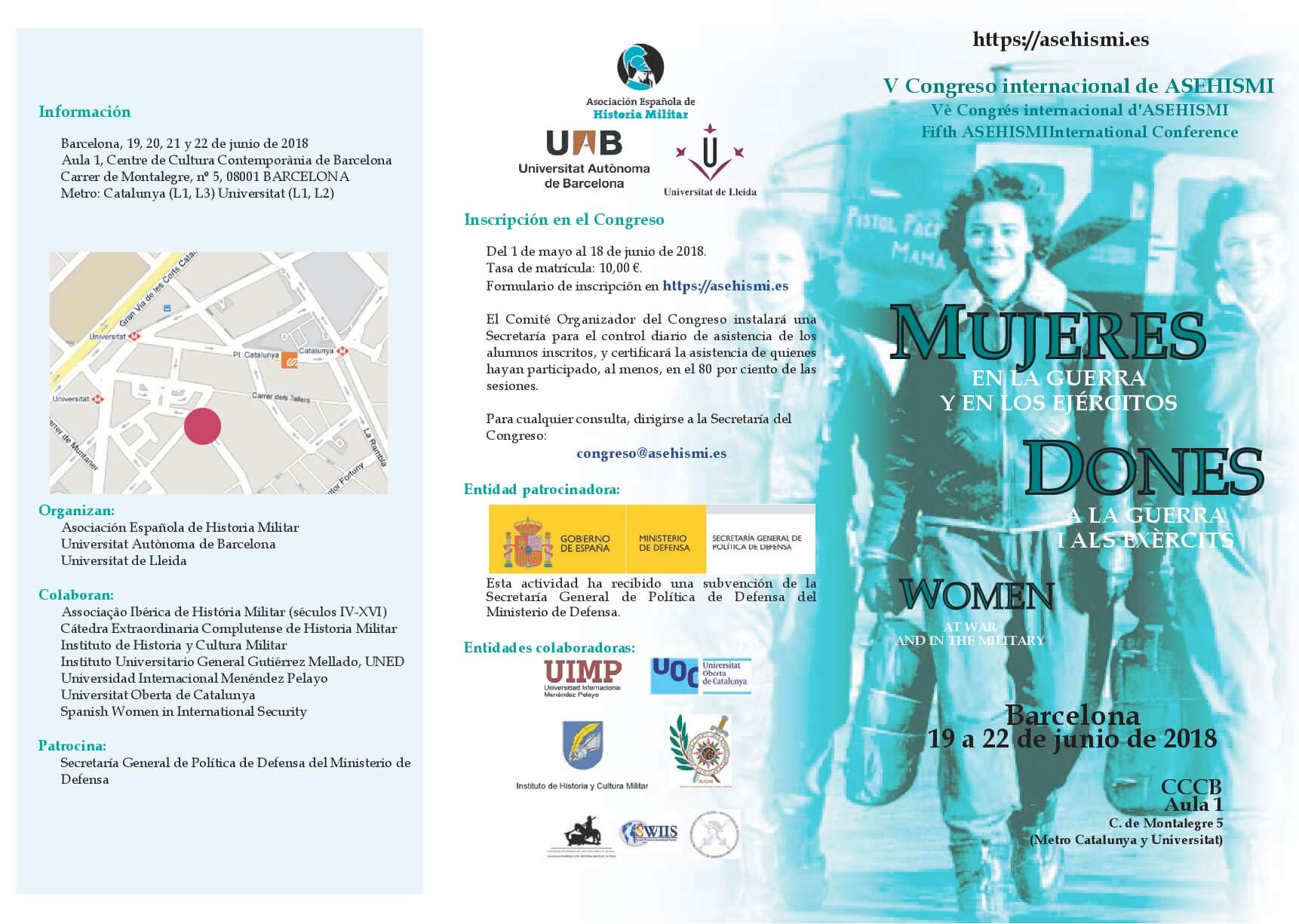 Desde hace muchos años, las mujeres han desempeñado un importante papel en la guerra, aunque a menudo haya quedado bastante eclipsado por la preponderancia del hombre en los campos de batalla, en ocasiones reducido al mito, como nos cuenta Adienne Mayor en su libro Amazonas. Guerreras del Mundo Antiguo. Actualmente, desde el punto de vista histórico, se ha autorizado su presencia en las filas de algunos ejércitos, al principio en unidades de carácter logístico y posteriormente en las combatientes. Además, el fenómeno bélico, en el presente y en el pasado, ha generado diversos efectos colaterales; de forma muy destacada, la integración de las mujeres en el mundo laboral y su progresiva comparación social con los hombres, así como la ocasional aparición de un tipo específico de violencia de género. Con el fin de poder reflexionar sobre todas estas realidades, la Asociación Española de Historia Militar (ASEHISMI), fiel a su trayectoria de propiciar la investigación sobre temas que conciten el interés de la sociedad, ha decidido dedicar el V Congreso Internacional ASEHISMI a las mujeres en la guerra y en los ejércitos, un encuentro académico interdisciplinar encaminado a estudiar el papel desempeñado por las mujeres en los conflictos bélicos, la influencia de las guerras sobre su posición en la sociedad, y la entrada y relevancia de las mujeres en los ejércitos.