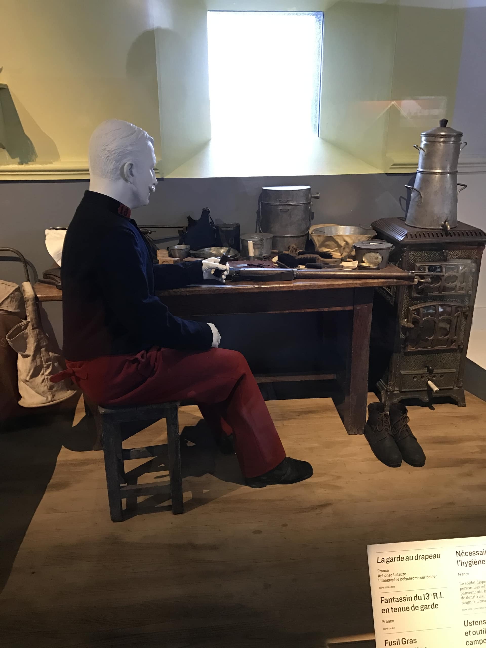 Por otro lado, el Museo de la Gran Guerra de Meaux vuelve a los uniformes en diferentes salas. En una de ellas se muestran la mayor parte de los uniformes utilizados en la Europa de aquellos años. Los neutrales tienen su sitio, aunque los beligerantes como era evidente son los que más espacio ocupan. Hay uniformes incluso de los distintos voluntarios checos que combatieron en la Gran Guerra con Italia, Rusia o Francia. En las estancias aledañas se observa lo que podemos denominar como “escenas de guerra”, donde se recrea campamentos británicos y estadounidenses. Se muestra todo tipo de material, no solamente el armamento, también utensilios de uso común en el día a día de la tropa.