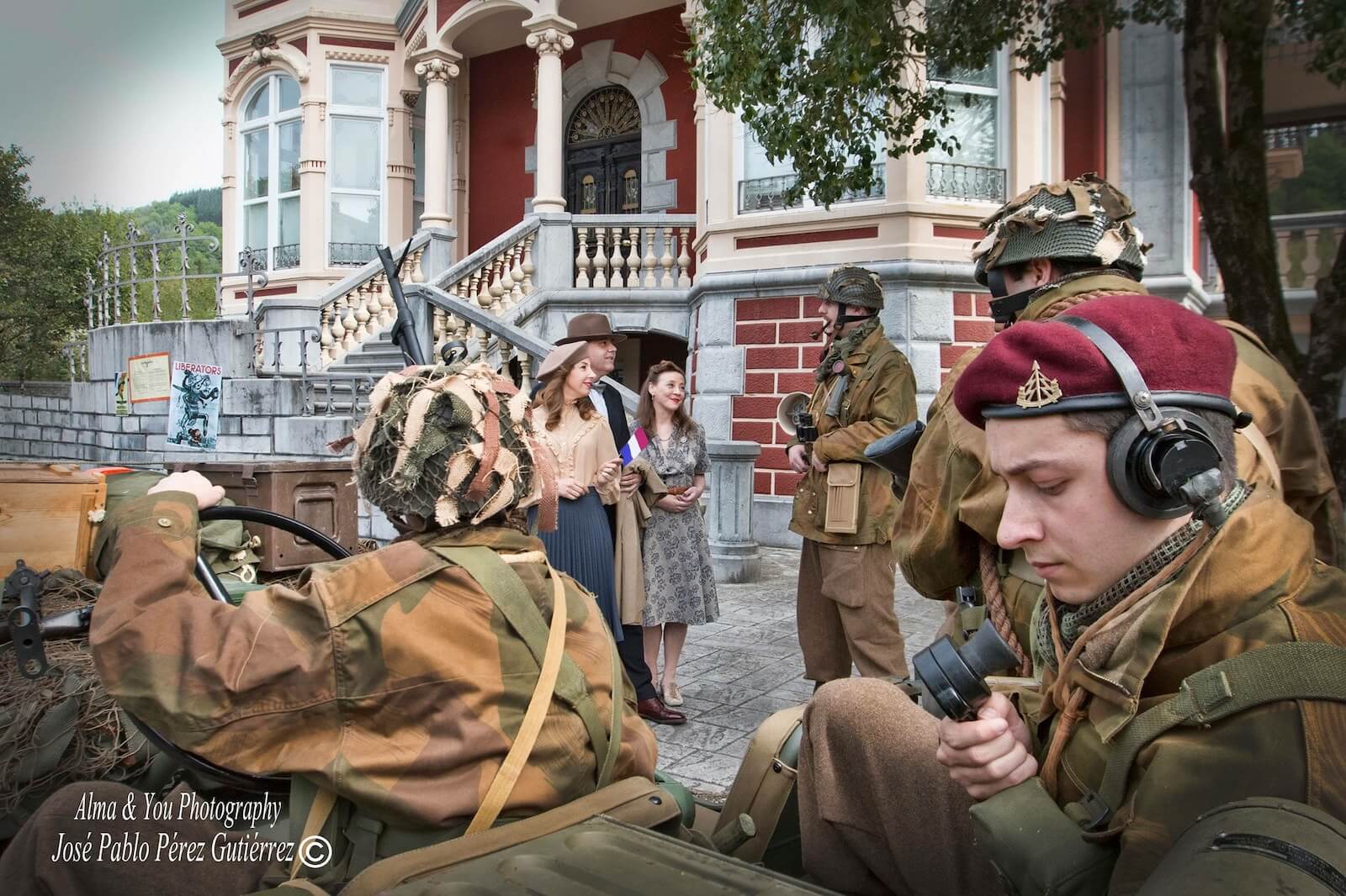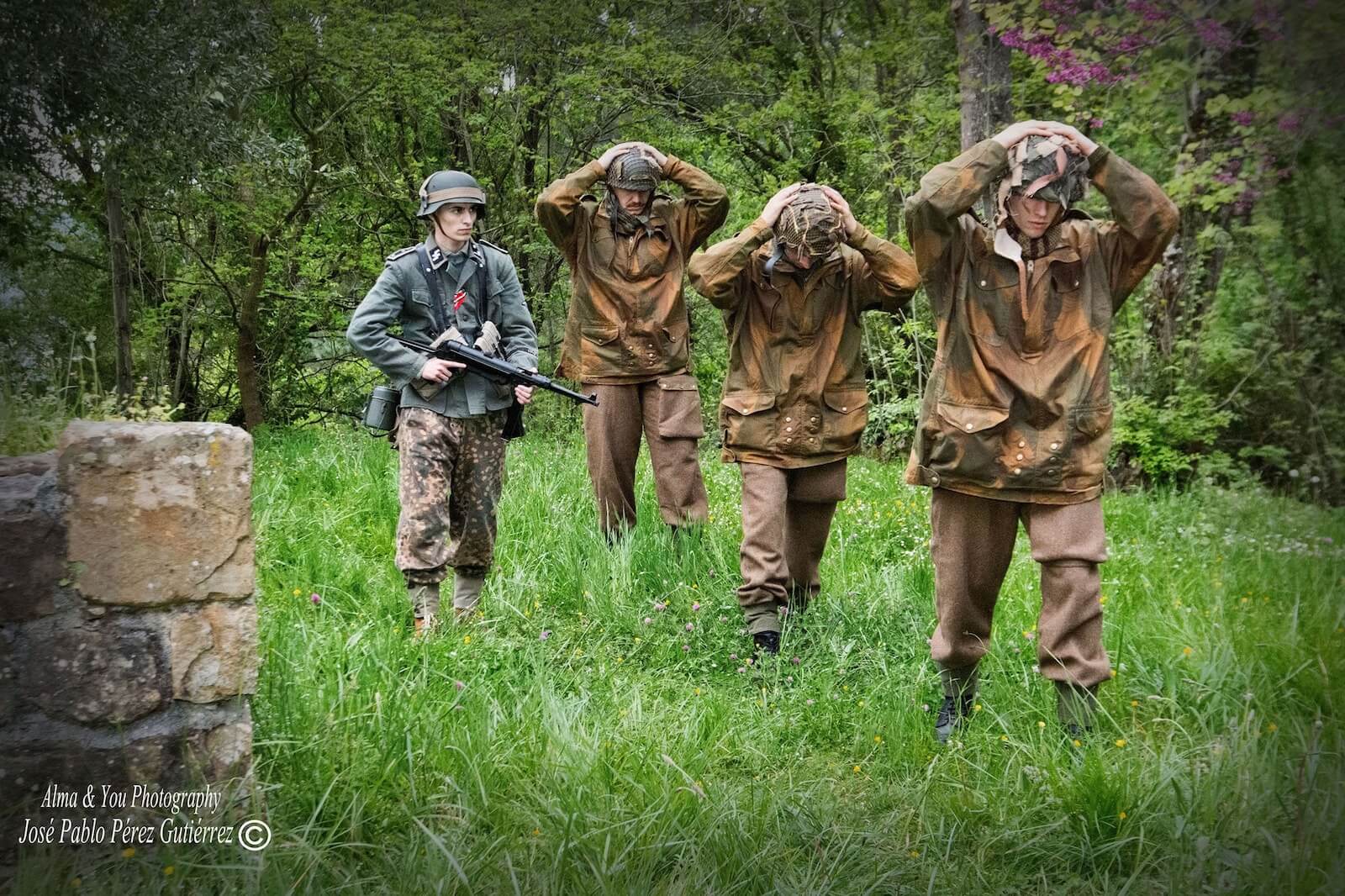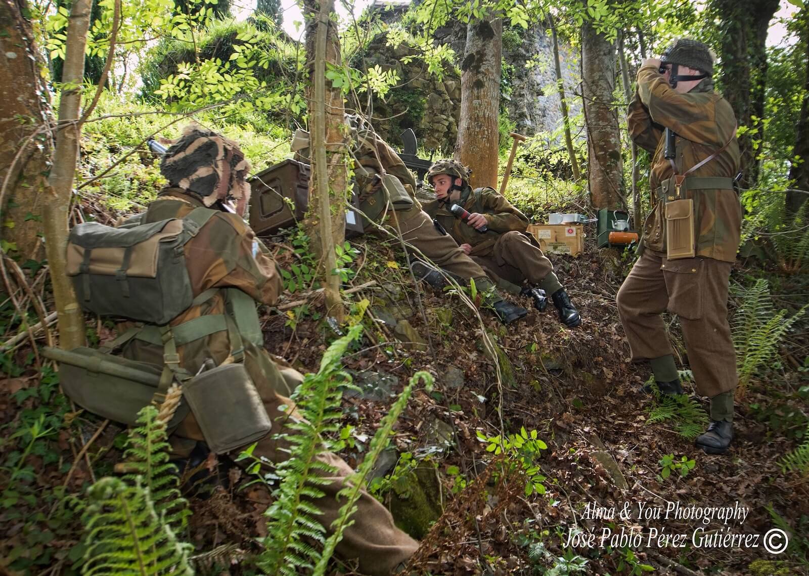 El trabajo de los recreadores –un total de ocho participaron en la sesión– fue extraordinario y muy estimulante para todo el equipo, y ofreció el resultado que puede verse en las fotografías; de los tres civiles se encargaron Raquel Rodríguez, Beatriz Gabriel y Raúl Lozano, que compusieron personajes con trajes y vestidos de época y muchísimos aportes personales. Emilio Pirla, de la conocida Sombrerería Gorostiaga (Bilbao), nos cedió amablemente algunos sombreros Fedora, un modelo muy usado durante la primera mitad del siglo XX, y boinas de mujer. De los personajes del jeep del escuadrón de reconocimiento de Irala se encargaron Igor Jubindo (teniente), Eder Artal (conductor), Eneko Tabernilla (trooper) e Iñaki Peña (operador de radio). Llevaban reproducciones del uniforme battle dress con el tono del paño del final de la guerra en Europa, además de chaquetas sobretodo “Denison” fabricadas por Kay Canvas, lo que garantiza la fidelidad de estas reproducciones, y equipo completo de paracaidista británico: casco, correaje “blanqueado” o tintado al estándar KG3, polainas, botas ammo boots, boina en color maroon (granate) con la insignia del Cuerpo de Reconocimiento, etc. Javier Petuya compuso a un suboficial alemán que captura a un grupo de paracaidistas británicos vistiendo una combinación de guerrera en color Feldgrau y pantalones de camuflaje Dot 44 que era muy común entre las tropas de las SS durante la batalla. Para obtener este resultado fue muy importante la colaboración de reconocidos fabricantes de atrezo británicos expertos en la Segunda Guerra Mundial, como Colin Hodgson (Relics) o Warren Reynolds (Shoot and Scoot-Airsoft Customs), y la ayuda de los profesionales con los que trabajamos habitualmente como la Academia de Corte y Confección Ana (Trapagaran) y Ancor Zapatería (Ortuella). La lista de amigos que nos dejaron cosas sería larguísima, como Ricardo Fernández Munilla o el propio Igor Jubindo. De coordinar a tanta buena gente se encargó un servidor, que contó con la ayuda de nuestros amigos Iñigo Artal y Raquel Llano, siempre atentos a cualquier necesidad que pudiéramos tener.