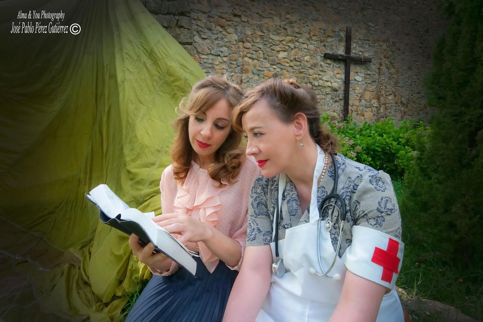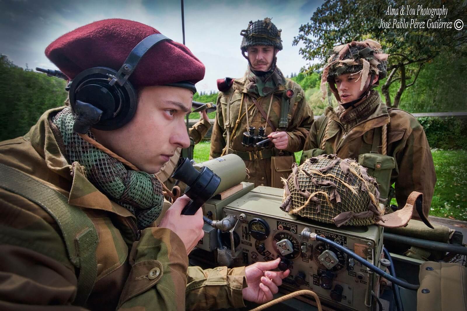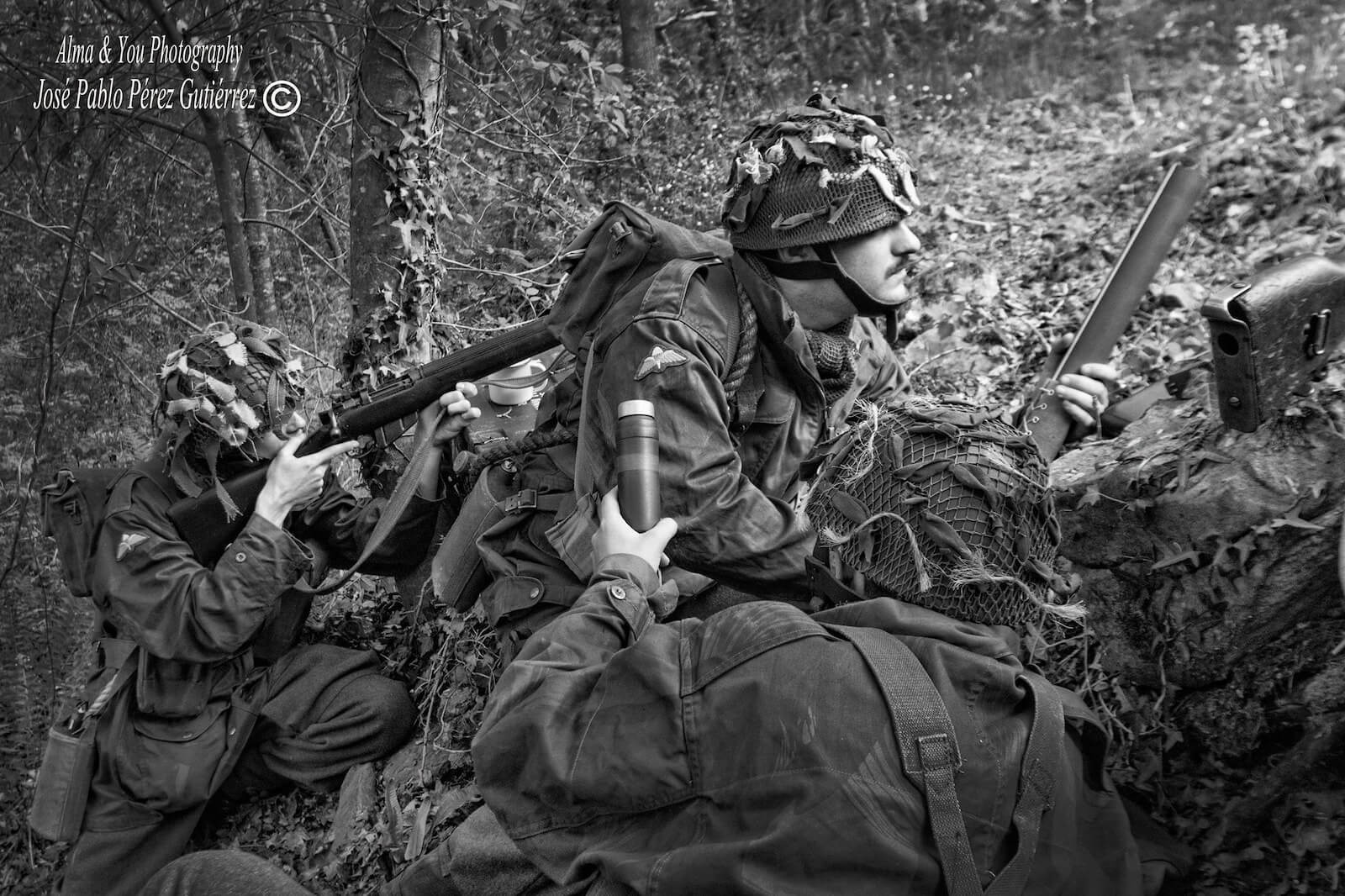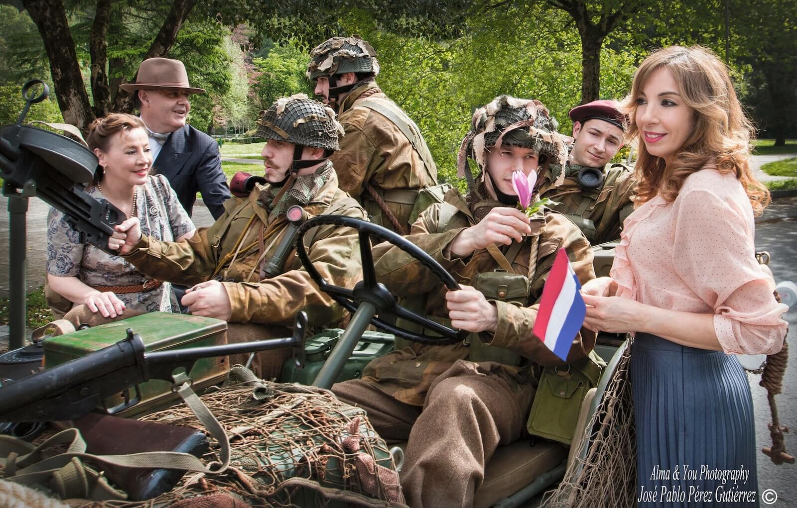 El trabajo de los recreadores –un total de ocho participaron en la sesión– fue extraordinario y muy estimulante para todo el equipo, y ofreció el resultado que puede verse en las fotografías; de los tres civiles se encargaron Raquel Rodríguez, Beatriz Gabriel y Raúl Lozano, que compusieron personajes con trajes y vestidos de época y muchísimos aportes personales. Emilio Pirla, de la conocida Sombrerería Gorostiaga (Bilbao), nos cedió amablemente algunos sombreros Fedora, un modelo muy usado durante la primera mitad del siglo XX, y boinas de mujer. De los personajes del jeep del escuadrón de reconocimiento de Irala se encargaron Igor Jubindo (teniente), Eder Artal (conductor), Eneko Tabernilla (trooper) e Iñaki Peña (operador de radio). Llevaban reproducciones del uniforme battle dress con el tono del paño del final de la guerra en Europa, además de chaquetas sobretodo “Denison” fabricadas por Kay Canvas, lo que garantiza la fidelidad de estas reproducciones, y equipo completo de paracaidista británico: casco, correaje “blanqueado” o tintado al estándar KG3, polainas, botas ammo boots, boina en color maroon (granate) con la insignia del Cuerpo de Reconocimiento, etc. Javier Petuya compuso a un suboficial alemán que captura a un grupo de paracaidistas británicos vistiendo una combinación de guerrera en color Feldgrau y pantalones de camuflaje Dot 44 que era muy común entre las tropas de las SS durante la batalla. Para obtener este resultado fue muy importante la colaboración de reconocidos fabricantes de atrezo británicos expertos en la Segunda Guerra Mundial, como Colin Hodgson (Relics) o Warren Reynolds (Shoot and Scoot-Airsoft Customs), y la ayuda de los profesionales con los que trabajamos habitualmente como la Academia de Corte y Confección Ana (Trapagaran) y Ancor Zapatería (Ortuella). La lista de amigos que nos dejaron cosas sería larguísima, como Ricardo Fernández Munilla o el propio Igor Jubindo. De coordinar a tanta buena gente se encargó un servidor, que contó con la ayuda de nuestros amigos Iñigo Artal y Raquel Llano, siempre atentos a cualquier necesidad que pudiéramos tener.
