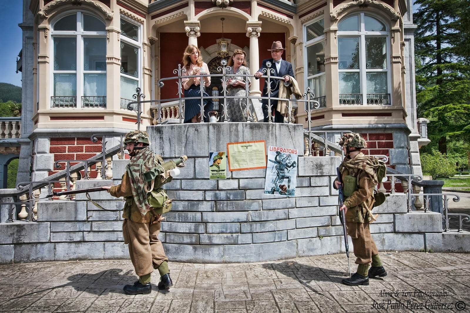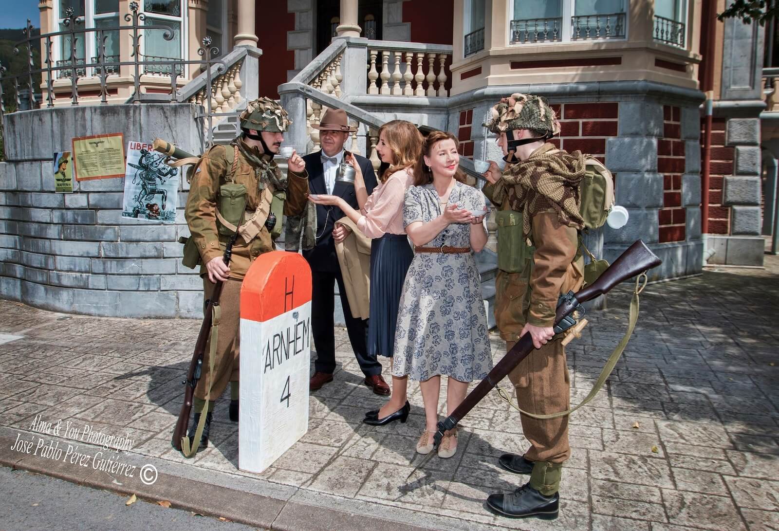Pensamos en una casa que se pareciera a las de los Países Bajos y se nos ocurrió Villa Urrutia, que desde 1974 es la casa consistorial de Güeñes (Vizcaya), para lo que pedimos permiso al Ayuntamiento de la localidad encartada, que no nos puso ningún problema, y se convirtió en nuestro primer escenario de los dos que usamos. Un bonito y colorido chalé de indianos con vistosos elementos modernistas que presenta una espectacular escalera que da a una calle, apartada de la carretera general, con una acera propicia en la que situar a tres civiles: un hombre y dos mujeres para recibir entre aclamaciones a los paracaidistas que avanzaban por Oosterbeek la tarde del 17 de septiembre de 1944, cuando aún se albergaba la esperanza de una victoria. La acera permitía colocar un elemento de época muy potente para el escenario que se proponía: un mojón de carretera con la indicación de que Arnhem estaba a 4 km. Además, en la pared se pusieron algunas reproducciones de carteles holandeses de la época del final de la ocupación de la Alemania nazi. Estos materiales, elaborados tras un proceso de búsqueda de documentación, dotaron al escenario de credibilidad sin apenas modificar nada y consiguieron la ambientación adecuada. En este sentido, además de la película casera de Clous, la escena de Un puente lejano en la que el doctor Jan Spaander (interpretado por Laurence Olivier) llega a casa de la señora Kate Ter Horst (Liv Ullmann) acompañado por un oficial médico británico (Richard Kane) sirvió de inspiración para alguna de las fotografías que ilustran este artículo.