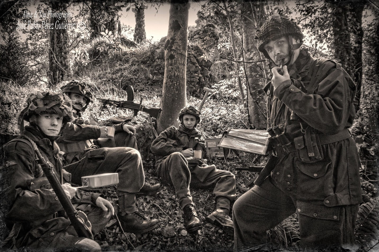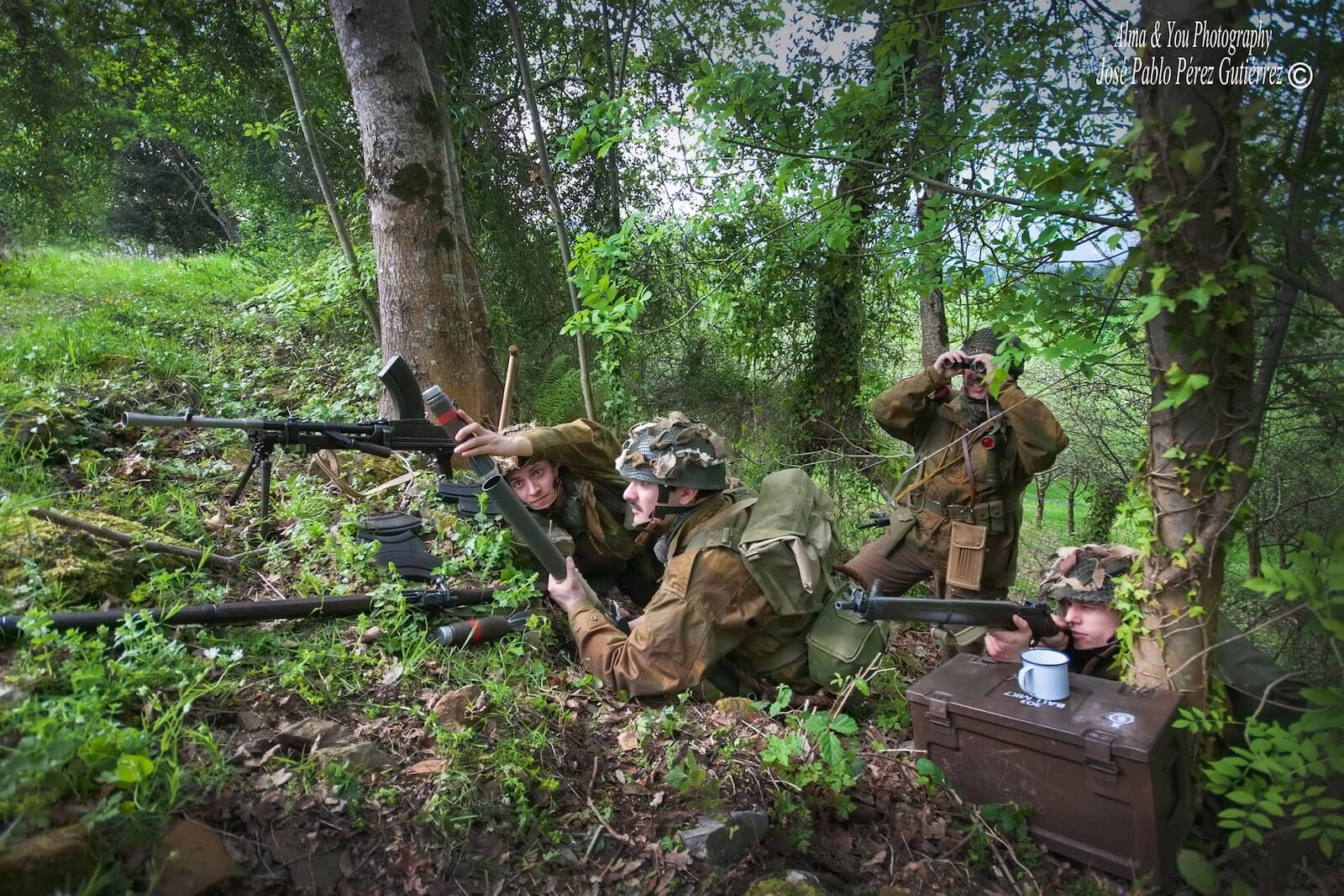 En un principio, el proyecto, nacido en 2015, se ceñía al período 1939-1945 y al bando aliado, pero como nuestro grupo de recreación es pionero en representar la Guerra Civil española en el ámbito vasco se ha decidido ampliarlo hasta 1936. Dentro del mismo, se han recreado también alemanes, italianos y japoneses únicamente como soporte para las escenografías, privadas en la mayoría de los casos, pues como asociación no tomamos parte en representaciones ni recreaciones públicas en aras a preservar nuestra libertad creativa, nunca por una cuestión discriminatoria. De este modo, intentamos generar alrededor de nuestros amigos y/o colaboradores un entorno discreto para poder trabajar con tranquilidad, siendo nuestros referentes los grupos que trabajan de modo avanzado el concepto del living history privado, como el 6th Battalion Durham Light Infantry, Northwest Paratroopers y British Corps, entre otros con los que venimos colaborando. El resultado son las sesiones de fotografías que hemos ido publicando los dos últimos años en diversos medios. Como sea que siempre hemos contado con la ayuda de nuestros amigos de Desperta Ferro en nuestros proyectos, nos hemos comprometido a redactar una serie de artículos con todo este material gráfico para apoyar el loable esfuerzo editorial que están realizando de cara a publicar información que permita que la gente pueda consumir cultura en sus casas y atemperar los efectos de esta pandemia del coronavirus, cosa que nosotros les agradecemos enormemente.