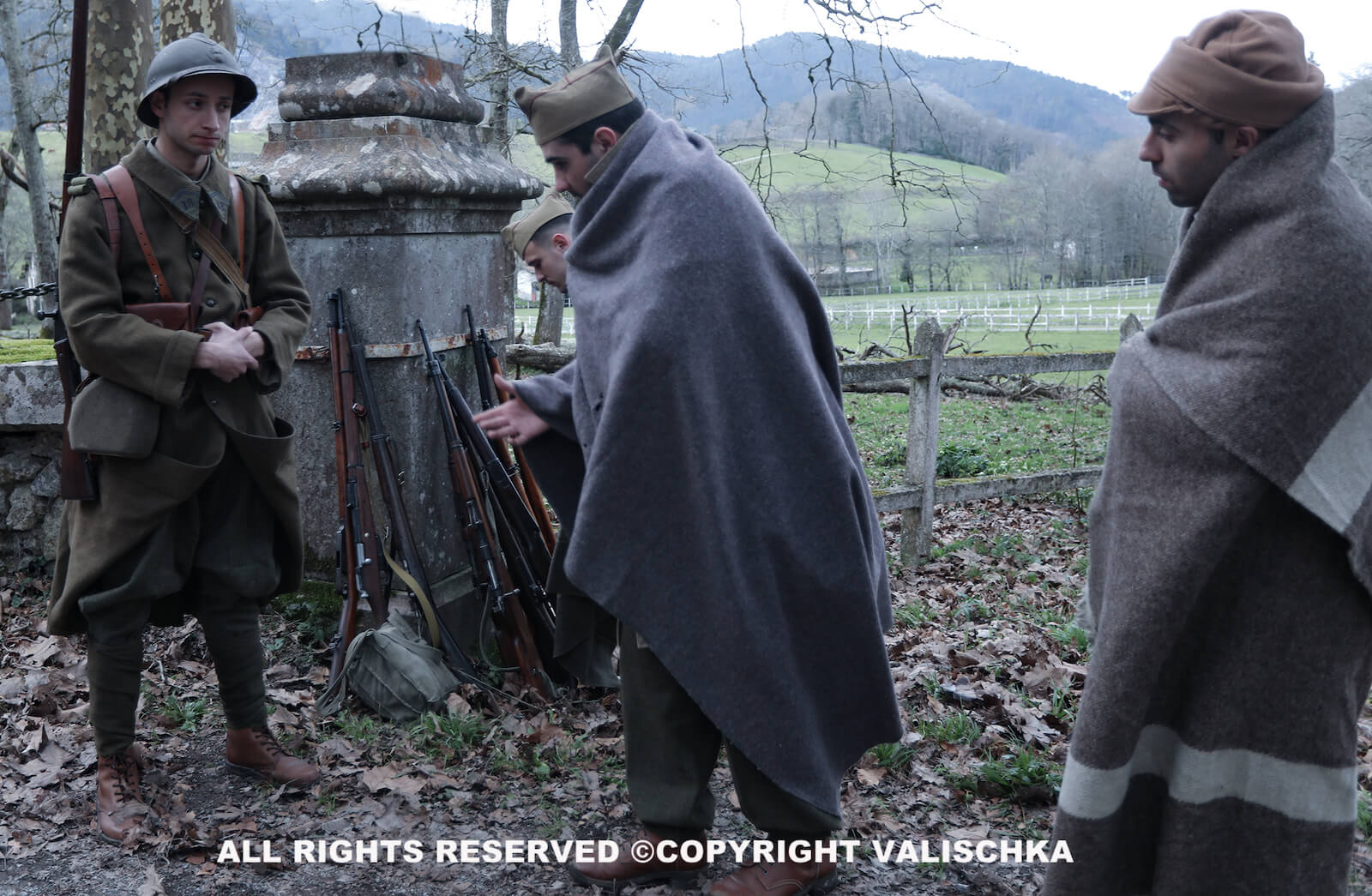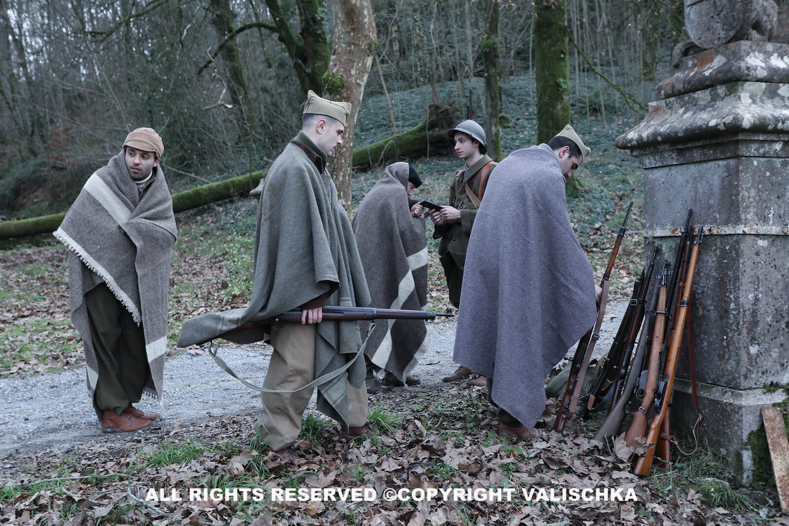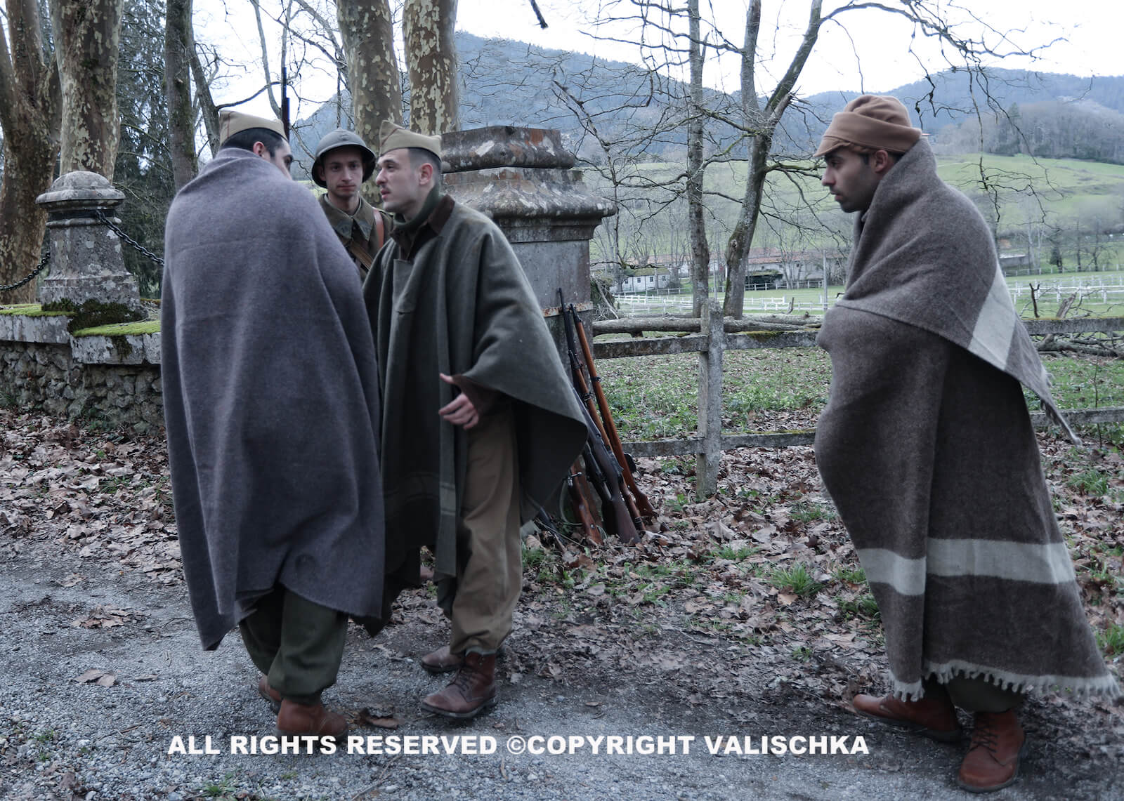 Con esta iniciativa no hacemos sino sumarnos a otras muchas que se han ido haciendo eco del drama del exilio que simboliza este acontecimiento histórico, con el fin último de que esta y otras memorias proscritas, como dice Rodrigo (11), se mantengan presentes en un debate público del que estuvieron alejadas durante años, algo que en este caso sucedió a ambos lados de la frontera, tanto en la España franquista como en la Francia gaullista. Por ejemplo, en estos últimos años hemos conocido la experiencia de los artistas que la sufrieron, como Josep Bartolí (12), el cómic de Paco Roca El ángel de la retirada (13) y numerosos artículos en medios de comunicación, también en el país vecino: France24, Radio France Internationale, El País, Eldiario.es, El Periódico de Catalunya, La Vanguardia, El Confidencial, etc. El ámbito museístico del espacio histórico que constituye La Retirada –si bien en un sentido más amplio, como señalábamos anteriormente, por lo que significa el concepto de frontera– nos permite aproximarnos a través de las rutas que atraviesan los Pirineos por los caminos de Cerdaña, Ripollés y el Alto Ampurdán, los memoriales, los centros de interpretación y otros recursos como vídeos y webs (14). La sesión de fotos se realizó el domingo 13 de febrero de 2022 para hacerla coincidir con el 83.º aniversario y tuvo lugar en los accesos al Palacio Munibe, en el término municipal de Etxebarria (Bizkaia), gracias a la amable colaboración de la Bilbao-Bizkaia Film Commission y la Diputación Foral de Bizkaia, propietaria de la finca. De la fotografía se encargó uno de los más reconocidos fotógrafos del mundo de la recreación histórica, Valischka, que de nuevo ha plasmado en evocadoras imágenes todo este esfuerzo recreador. Se encargaron de la composición de los personajes Egoitz Ereño, Iñaki Peña, Mikel León, Iker Baz y Eneko Tabernilla, a quienes queremos agradecer su trabajo, al igual que a nuestro amigo Fernando Alcoya, del grupo Primera Línea, que compartió esta jornada con nosotros.