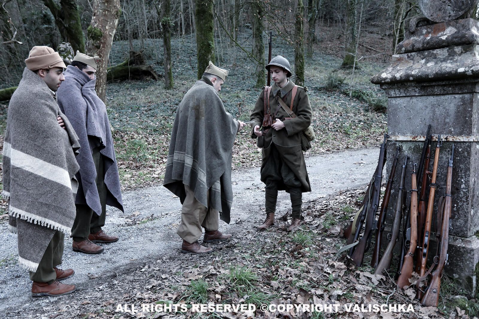 Los fusiles se van amontonando con la llegada de nuevos soldados que, a pesar de su juventud, reflejan en sus caras el cansancio de la larga marcha que los ha llevado a atravesar los pasos del Pirineo camino de Francia mientras las tropas franquistas les pisan los talones. Uno de ellos mira hacia atrás consciente de que otros compañeros han quedado cubriendo la retirada (Valishka Fotografía).