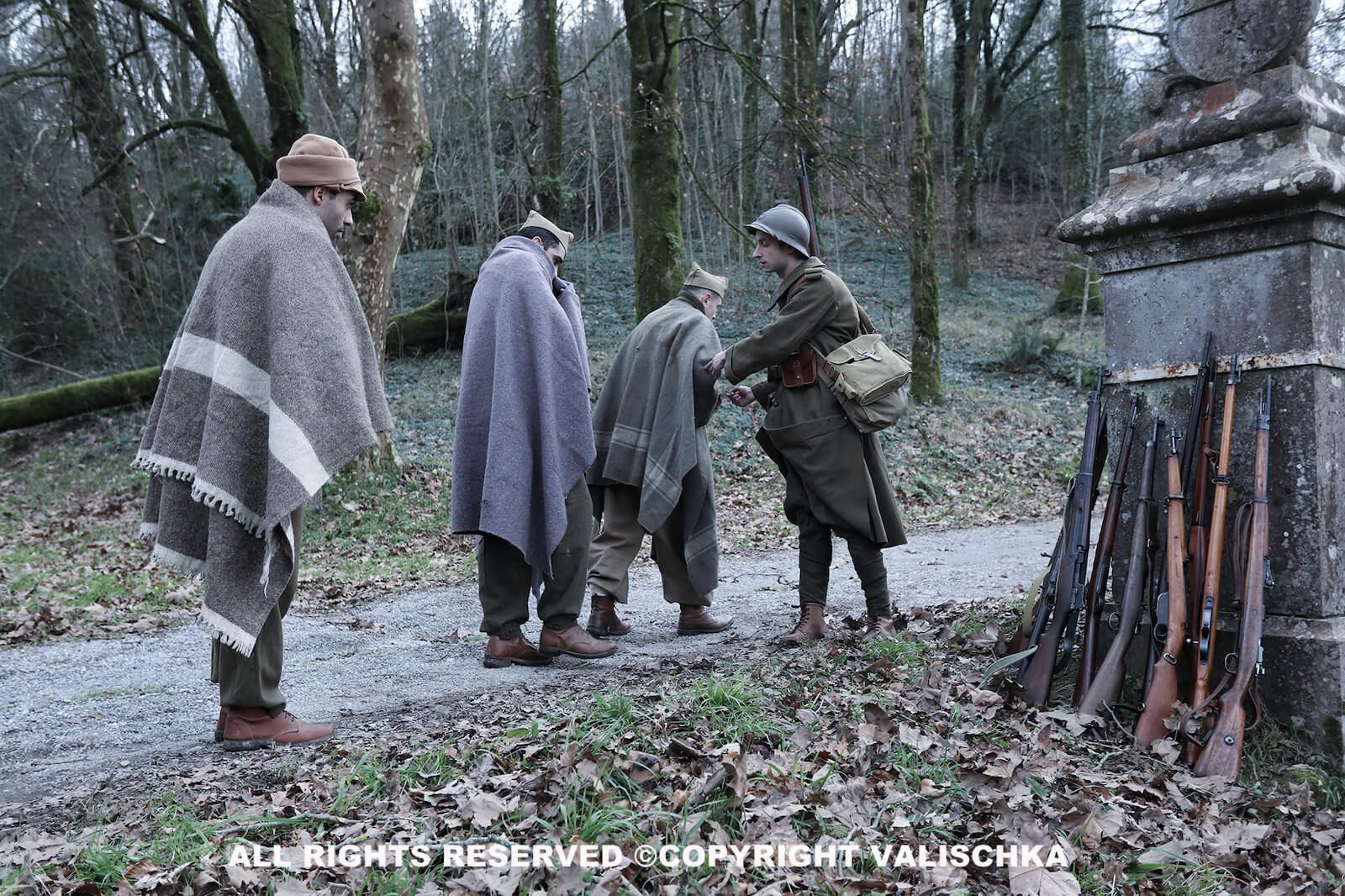 Como hemos insistido últimamente al hablar de recreación histórica, esta puede poner en valor tanto el patrimonio material como el inmaterial, especialmente en el caso que nos ocupa, conmemorando determinadas efemérides que no siempre cubren los medios de comunicación y que hemos ido compartiendo con todos ustedes en este mismo blog, ya sea en el caso del 80.º aniversario de la batalla de Carelia, el 80.º del ataque a la base aeronaval de Pearl Harbor o el 100.º del nacimiento de Berlanga. Recordando, no solo sobrellevamos un pasado incómodo, como dice Javier Rodrigo (10), sino que además podemos empatizar con la generación de la Guerra Civil y el exilio, y es ahí donde entra la recreación histórica como una alternativa que nos proporciona los materiales para ello, permitiendo una inmersión que parte en primer lugar del propio recreador y después se traslada al público –aunque la escenografía que aquí les proponemos fue privada, siguiendo la dinámica de trabajo de nuestro proyecto, no lo es su resultado, como demuestran las fotografías que acompañan a este artículo–, ya que el objetivo de todo este trabajo sigue siendo visibilizar la memoria, pero desde el punto de vista del respeto a la verdad histórica, porque hoy y aquí no nos interesa una visión mitificada e incluso ficticia de la misma, como si sucedió durante el homenaje que le hicimos a la película La vaquilla. De este modo, en las imágenes hemos buscado el simbolismo del mojón y las cadenas para representar el límite de la frontera y la separación física de los combatientes republicanos, a los que da paso un soldado francés camino de un “cautiverio” que no pueden imaginarse, si bien sus miradas siguen estando en lo que dejan atrás. A un lado, quedan los fusiles amontonados, que reflejan la derrota de todo el Ejército Popular al final de la Guerra Civil. Obviamente, nos hemos inspirado en fotografías originales, que constituyen verdaderos documentos gráficos.