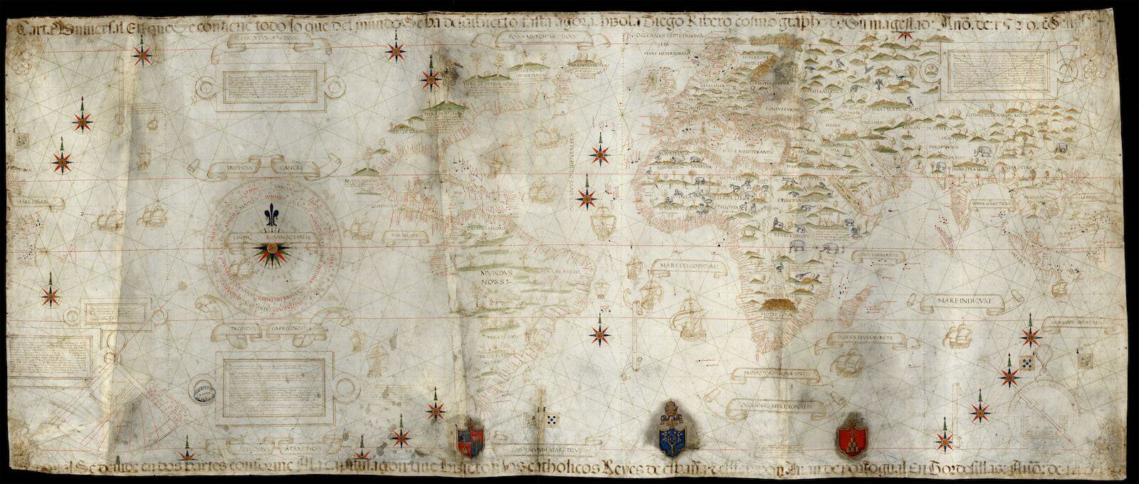 Carta universal en que se contiene todo lo que del mundo se ha descubierto fasta agora, hizola Diego Ribero cosmographo de su magestad, año de 1529, e[n] Sevilla / La cual se devide en dos partes conforme A la capitulacion que hizieron los catholicos Reyes de españa y el rrey don Juan de portogual En Tordesillas Año de 1494, mapa realizado por Diego Ribero en Sevilla en 1529 y que recoge los descubrimientos de la primera circunnavegación de la tierra iniciada en 1519 por Magallanes y culminada en 1522 por Juan Sebastián Elcano. Pincha en la imagen para ampliar.