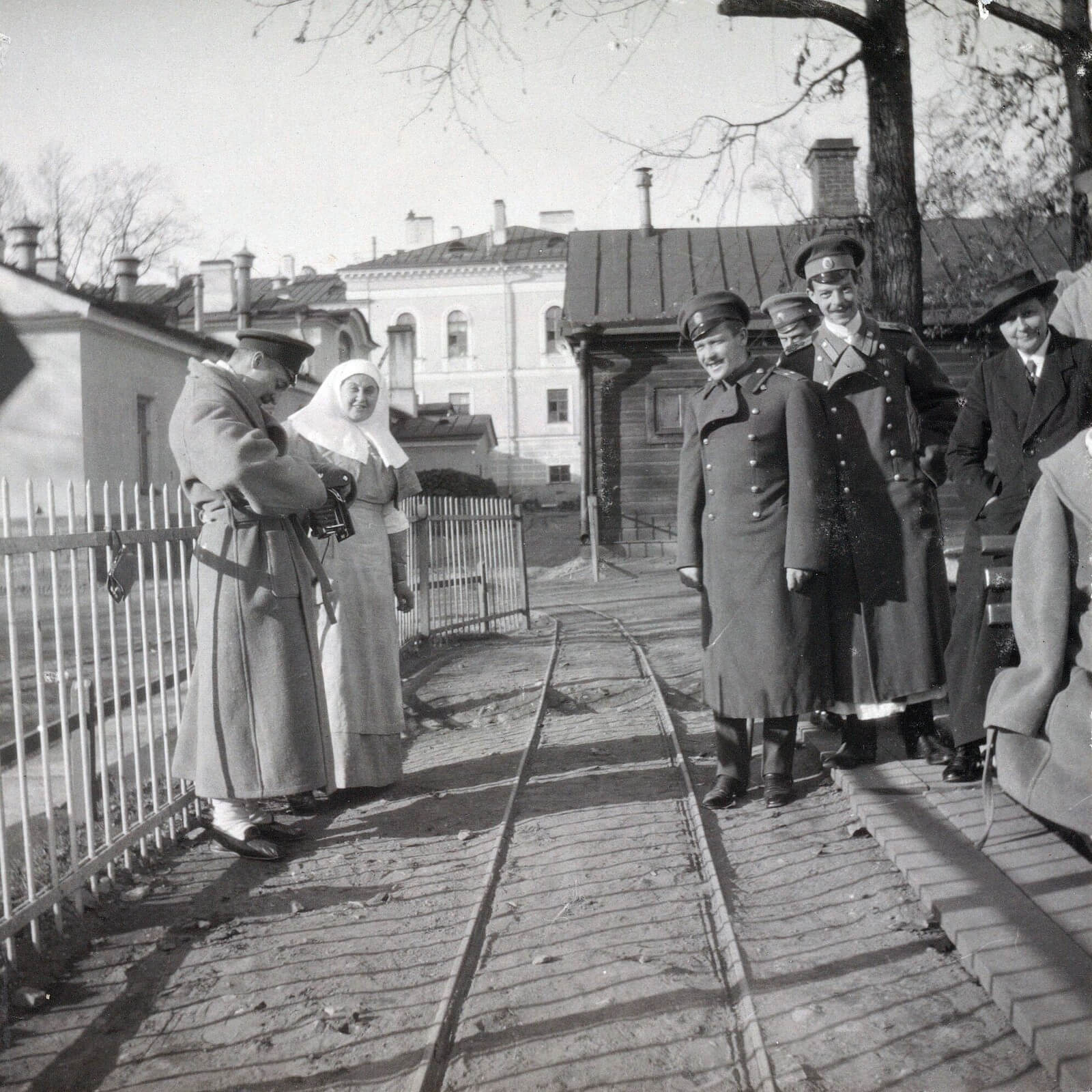 La influyente Anna Aleksándrovna Výrubova (a la derecha de la foto, vestida con un gabán oscuro y sombrero), dama de honor, amiga y confidente de la zarina, posa con Vera Gedroitz y miembros destacados de la Stavka en el patio del hospital, ca. 1915. Wikimedia Commons.