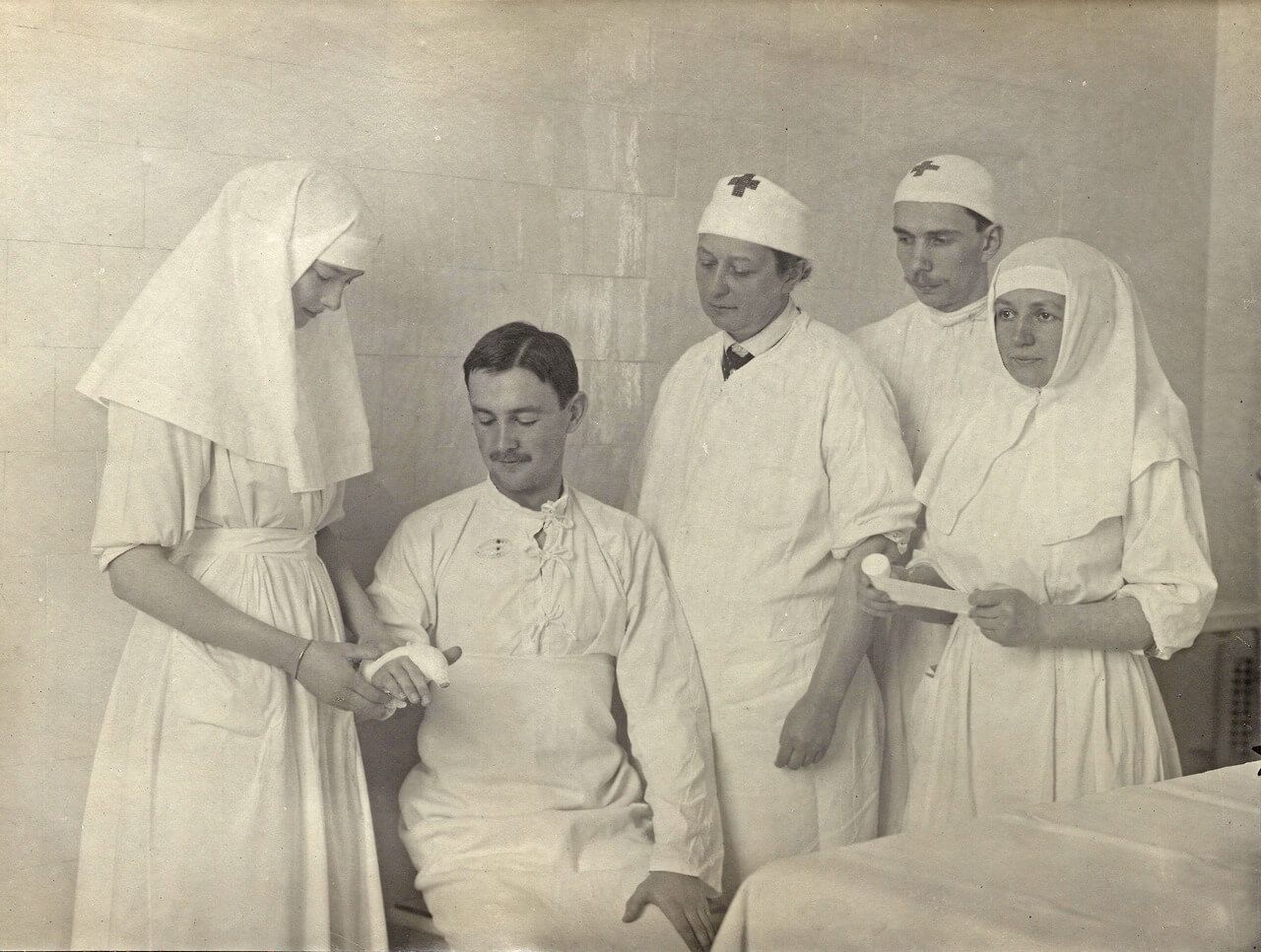 La gran duquesa Tatiana Nikoláyevna venda al teniente Alexander Fedórovich Batievski en la enfermería del Gran Palacio bajo la atenta mirada de Vera Gedroits. Tsarskoye Selo, febrero-marzo de 1916. Wikimedia Commons.