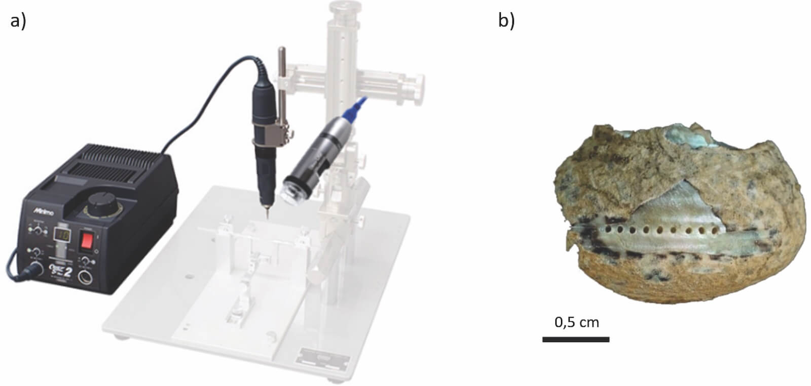La aplicación de esta metodología analítica precisa de la toma de micro-muestras de carbonato a lo largo de la espiral de las conchas, con el objetivo de poder reconstruir así la variación de la composición isotópica de ésta, la cual es representativa de los cambios de temperatura del mar ocurridos durante la vida del molusco. Para la toma de micro-muestras de carbonato en la capa de aragonito de la concha se utilizó un taladro manual sujeto a una base para así situarlo de manera perpendicular a la concha y un microscopio digital de la marca Dino-Lite (Fig. 5a). La broca utilizada fue de tungsteno y de 0,5 mm. La primera micro-muestra se tomó desde la parte interna del borde o abertura de la concha, para así evitar una posible rotura de éste al eliminar las capas externas de calcita, y el resto se tomaron desde la parte externa cada 1 mm (Fig. 5b). La investigación descrita se encuentra en desarrollo y todavía no se cuentan con resultados. Sin embargo, es esperable que estos permitan descifrar con precisión el momento del año en el que se produjo la recolección de los individuos analizados, identificando así los patrones estacionales de recolección de marisco por parte de las poblaciones neandertales.