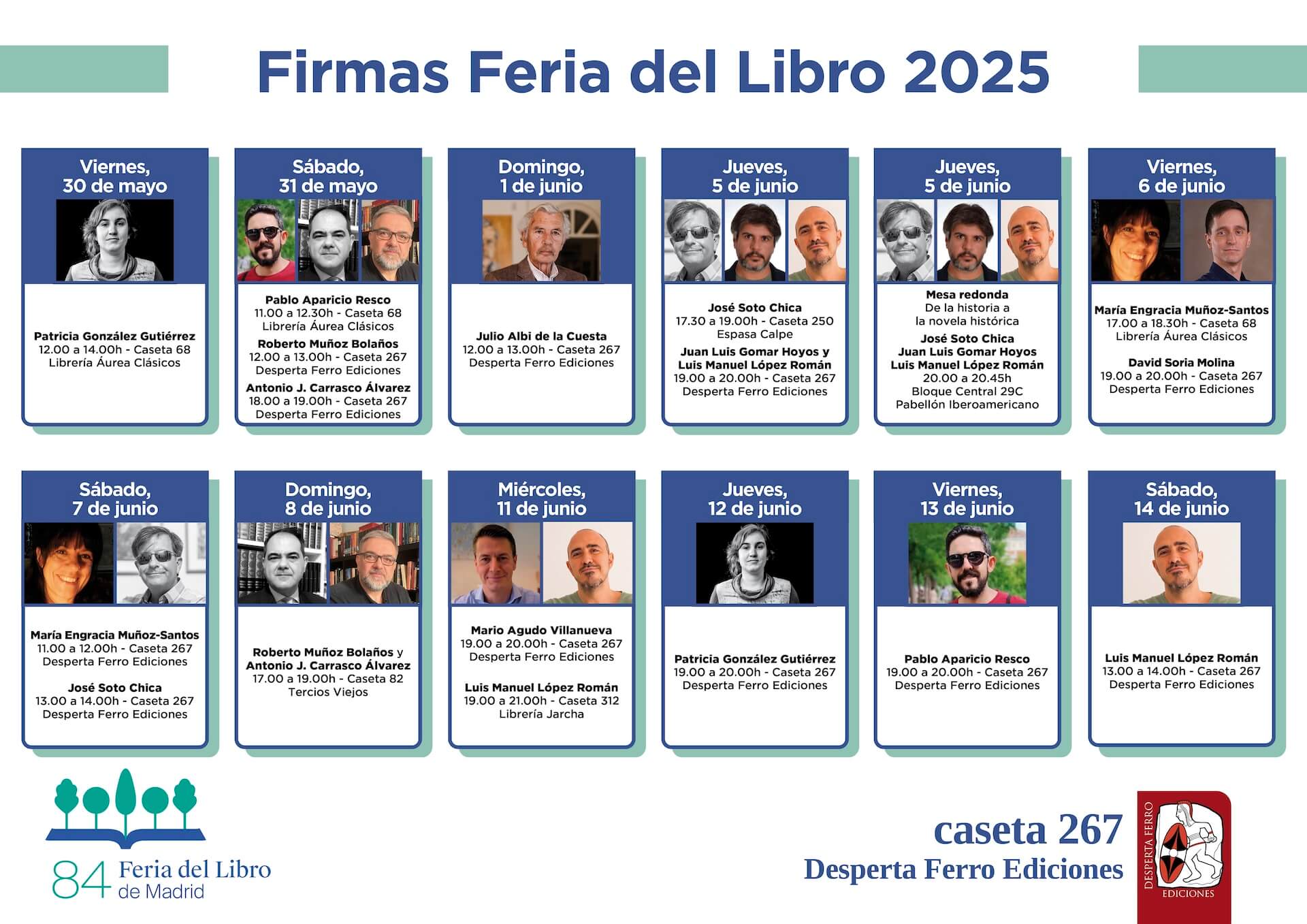 En esta edición contaremos con 19 firmas repartidas entre nuestra caseta y las de librerías y editoriales amigas con las que compartimos el espacio de la Feria del Libro de Madrid 2025, además de una mesa redonda, «De la historia a la novela histórica», con José Soto Chica, Luis Manuel López Román y Juan Luis Gomar, a la que estás invitadísimo, que se suma a una agenda completa para que puedas conocer a nuestros autores y autoras.
