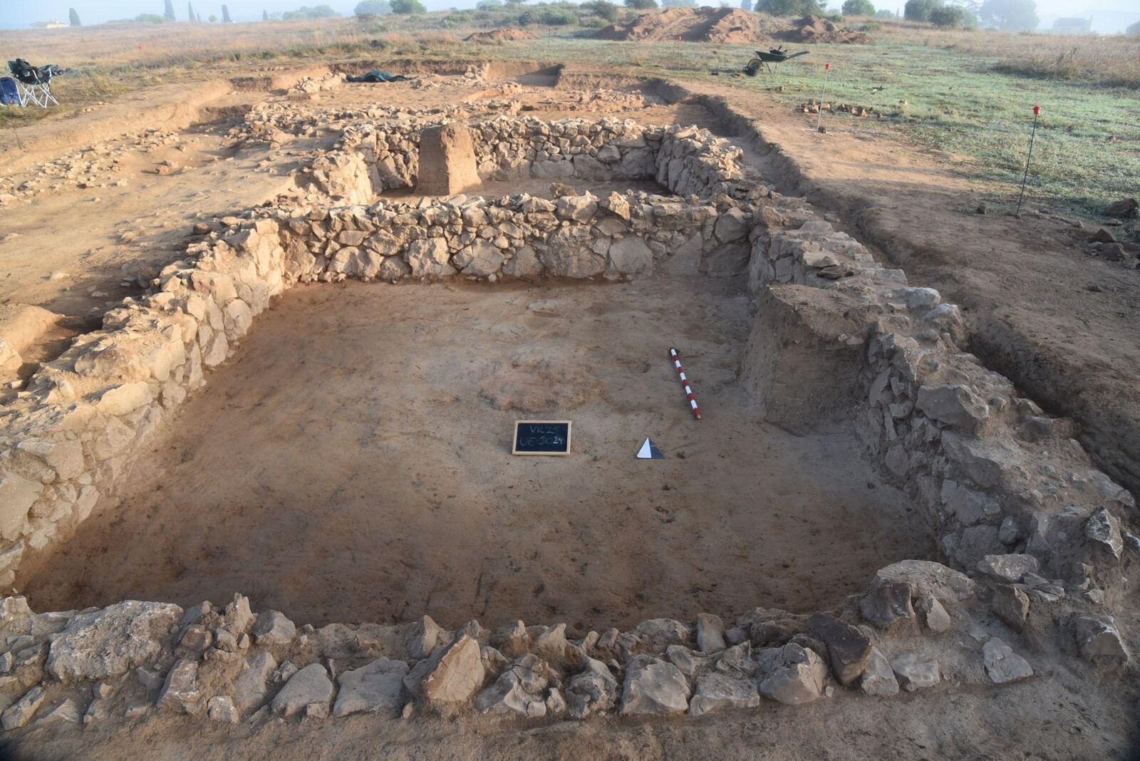 Figura 3. Vista de uno de los edificios de planta compleja documentados en el yacimiento del Turó de Vilanera. En la estancia principal puede observarse un hogar central. © Proyecto Paisajes y vidas cotidianas en el entorno de Emporion