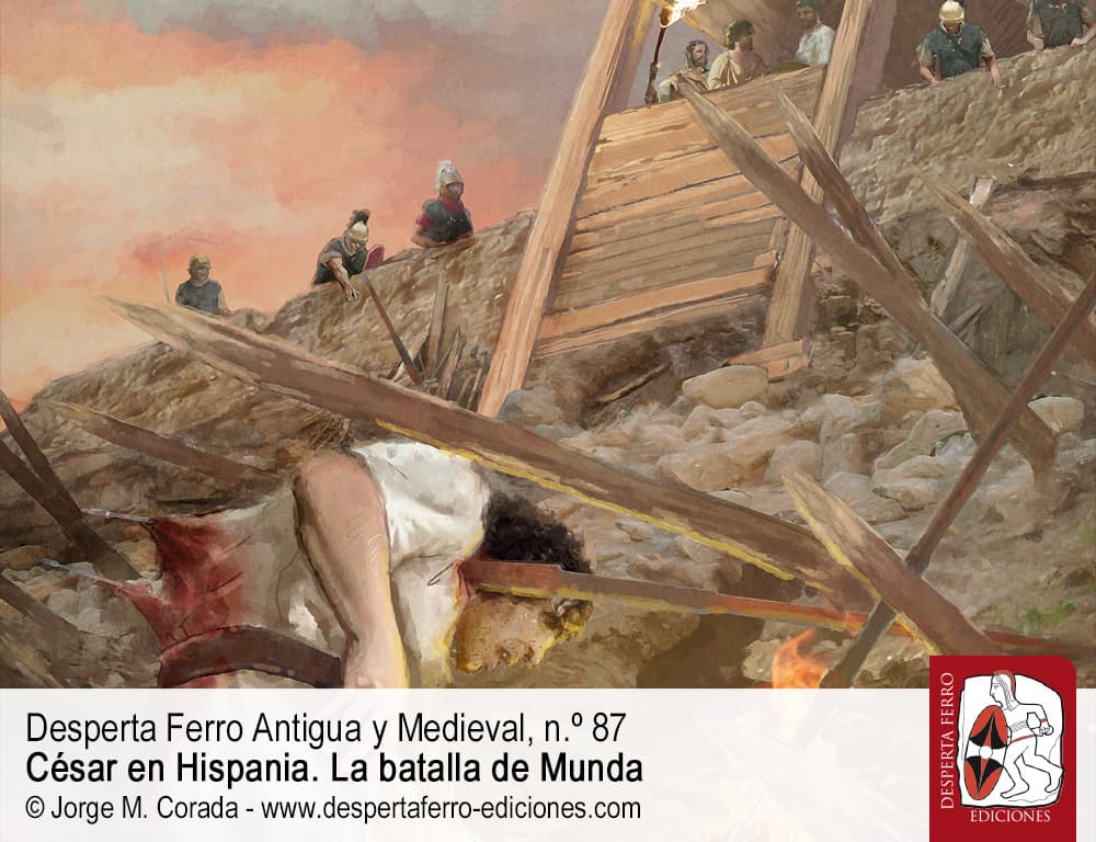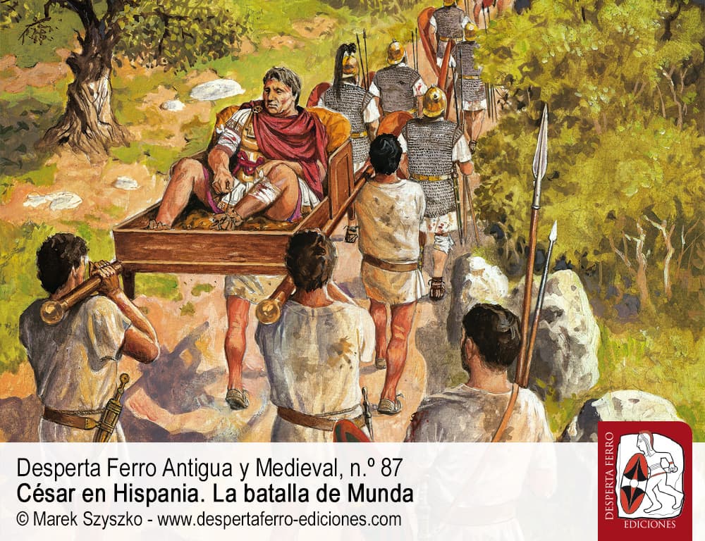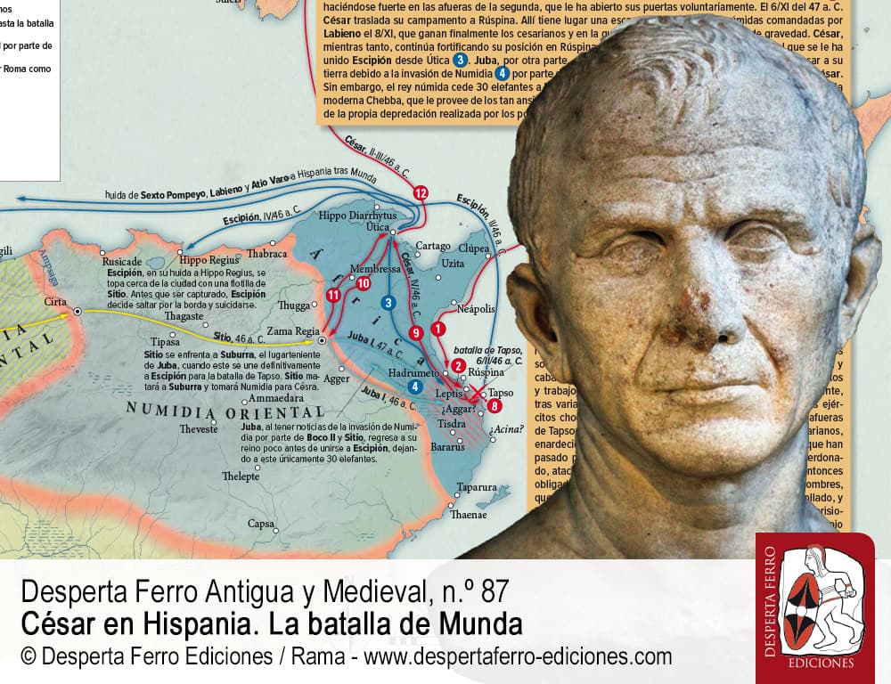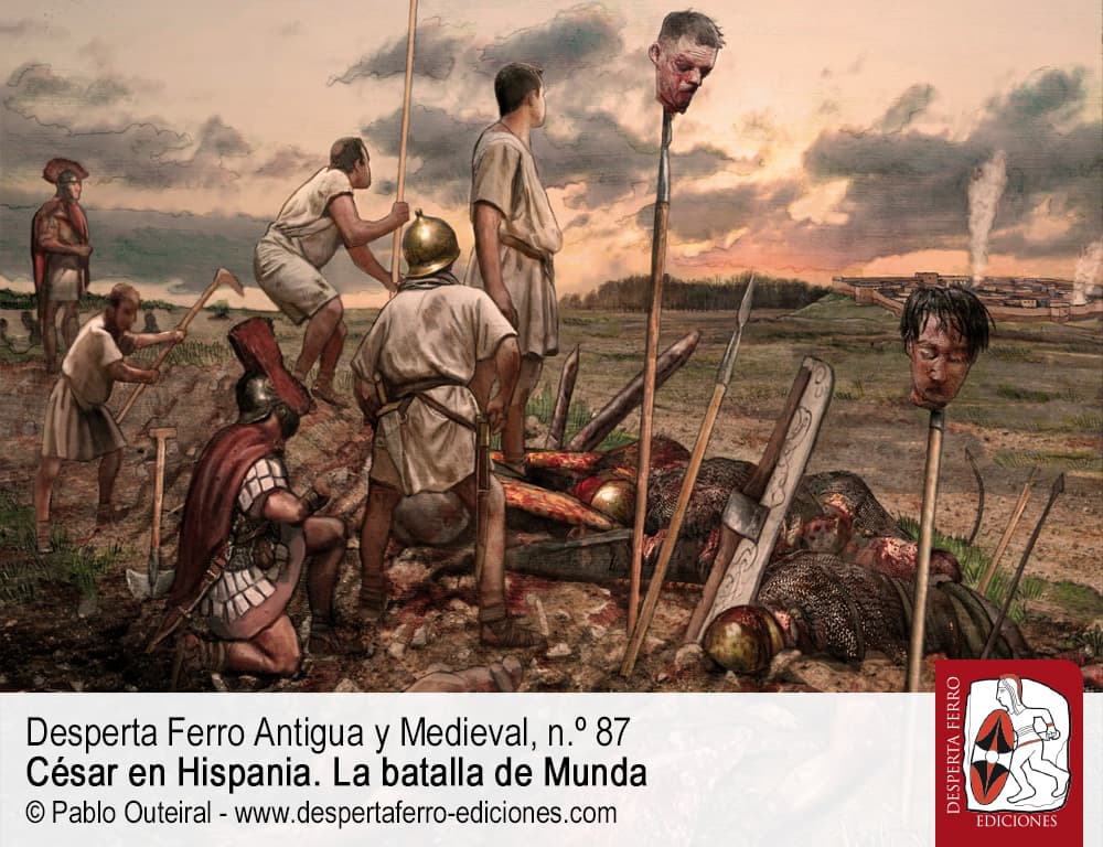 La derrota y posterior muerte de Pompeyo Magno no pusieron fin –ni mucho menos– a la crudelísima guerra civil que asoló la República romana a mediados del siglo I a. C. Algunos de sus simpatizantes hallaron refugio en el norte de África, de dónde pronto fueron desalojados por un César triunfante. Quedaba por tanto un único refugio para los pompeyanos: Hispania, a donde acudieron todos aquellos que se oponían al gobierno autocrático de César y, en su lugar, soñaban con la restauración de la antigua república oligárquica. Fue por tanto en Hispania, y en torno a Cneo y Sexto Pompeyo, los hijos del malhadado antagonista de César, donde se reunieron numerosos aristócratas y numerosas legiones dispuestas a resistir al “tirano”. Y fue así como el nuevo amo de Roma se vio obligado a emprender una campaña militar en Hispania que, contrariamente a lo que había sucedido en otras ocasiones, resultó extremadamente dura y peligrosa. Finalmente, en marzo del año 45 a. C. ambos ejércitos se enfrentaron en una colosal y reñida batalla frente a la ciudad de Munda, donde a decir del propio César, “En Farsalia luché por la victoria, en Munda luché por mi propia vida”.