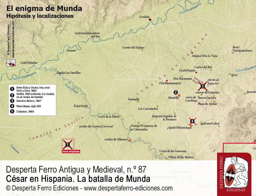 La batalla final se produjo en el que las propias fuentes antiguas denominaron campus mundensis, a los pies de la ciudad bética de Munda (Bell. Hisp. 27.6). La localización exacta de esta ciudad, y del emblemático campo de batalla, ha sido uno de los interrogantes históricos más polémicos y controvertidos en la historiografía española desde el siglo XVI hasta nuestros días.
