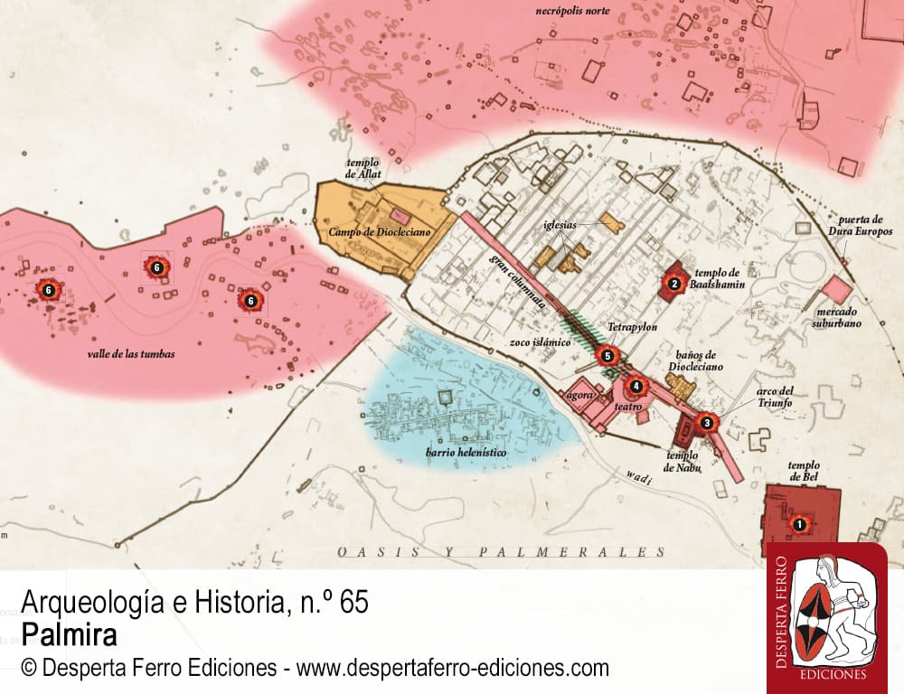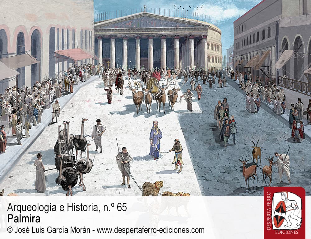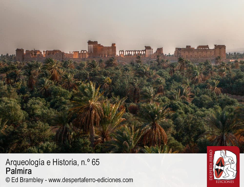 Una ciudad en el desierto. Tras sus muros pasa, lentamente, una caravana en que los dromedarios, perezosos, avanzan hacia el caravasar en que podrán librarse de su carga y, por fin, descansar un poco y beber. Dentro de los mismos, se alzan impresionantes templos, largas calles con columnas y esculturas, cuyas inscripciones aparecen, además de en griego, en arameo, con un alfabeto propio. Sus gentes son el resultado de una mezcla de culturas, de los amorreos a los griegos, de los habitantes nómadas de las estepas a los romanos. Por allí pasaron, de forma pacífica o no, multitud de pueblos. Incluso en su nombre, muestra su cultura diversa y dual. Su nombre más conocido, para nosotros, es el griego –y luego romano–, Palmira. Pero antes y después también se denominó Tadmor, nombre que aún conserva. Su posición estratégica le permitió dominar el comercio a larga distancia mucho tiempo y luego, ya totalmente perdida su independencia, tras el intento de Zenobia de alcanzar el poder imperial, se transformó en un núcleo militar. Fue también el centro religioso para numerosos pueblos y tribus de alrededor y su manantial principal, el hogar de un poderoso dios. Sus templos pasaron a iglesias y luego a mezquitas, mientras las religiones del libro convivían en los últimos alientos de lo que fue una ciudad poderosa. Fue una ciudad, también, que, aún en ruinas, vio los horrores de la guerra, el saqueo y la destrucción. Y sus calles volvieron a llenarse de sangre casi dos milenios después de su última gran destrucción. Es una ciudad que no deja de llamarnos poderosamente, que, sin embargo, también ha sido muy olvidada en su historia más allá de los mitos. Es hora de acercarnos a Palmira, a su oasis y su desierto, para ir más allá de lo superficial y poder entender su rico pasado y su preocupante presente.