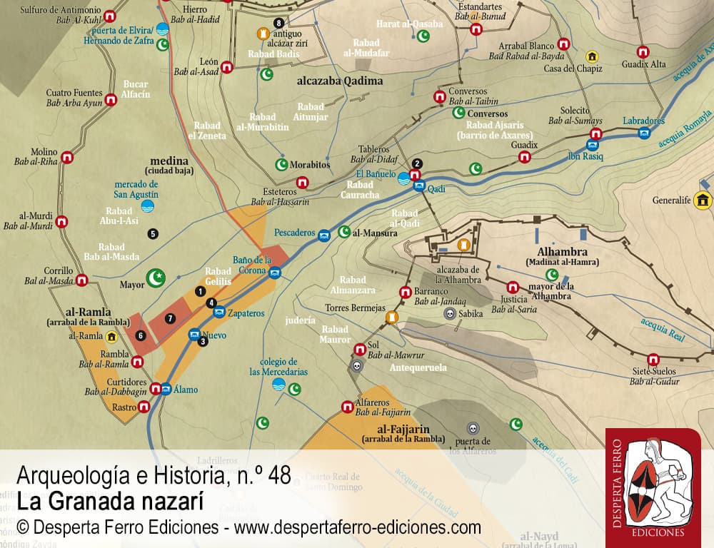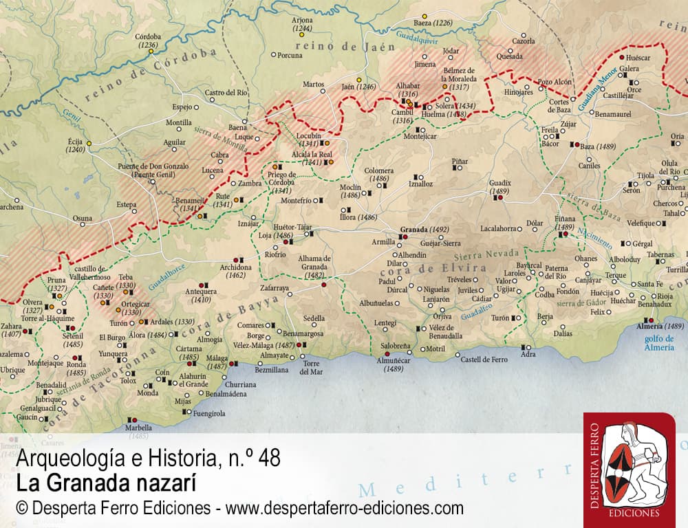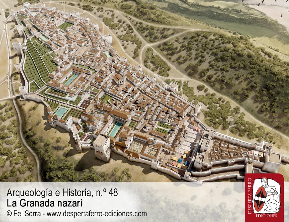 El emirato nazarí de Granada (1232-1492) fue uno de los reinos peninsulares más longevos del Medievo, aunque su imagen de solidez se ha visto lastrada por aquella famosa escena de la entrega de las llaves por parte de su último monarca, Boabdil, a los Reyes Católicos. Lo cierto es que, aunque el reino no dejó de ser hostigado por los reinos cristianos en expansión –con lo que ello suponía para los habitantes de los territorios fronterizos, que vivían con la constante inquietud sobre su futuro–, la vida en el emirato se desarrolló por lo general de un modo estable y dinámico. La nazarí era una sociedad muy activa, que hizo gala de un comercio vivo que contó con una importante presencia en el Mediterráneo occidental, y de una economía rural que compaginó modos de producción orientados al autoconsumo con la explotación de productos más específicos y tan apreciados como la seda o el azúcar de caña. En el centro neurálgico del último reino de al-Ándalus, y al amparo de las cumbres de Sierra Nevada, la ciudad nazarí de Granada fue creciendo exponencialmente para albergar a una población musulmana en progresiva retirada, hasta convertirse en una de las más importantes de Europa. Alzándose en una de sus colinas, la espectacular Alhambra se erguía orgullosa como un auténtico emblema del reino, repleta de ostentosos palacios y a la vez protegida por sólidas murallas.