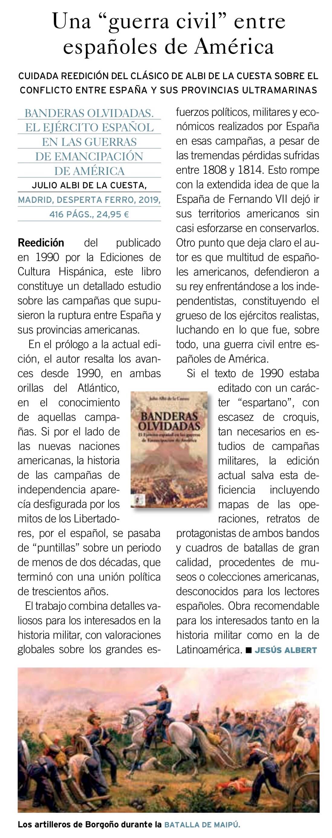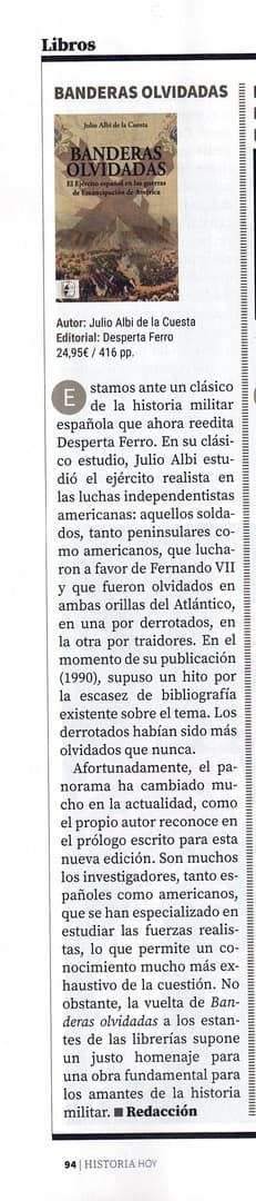 «Banderas olvidadas es un fantástico libro de introducción a las guerras de Emancipación americanas, escrito con un buen ritmo y accesible a todo tipo de público. Albi de la Cuesta escribió una obra que en su día abrió muchas puertas y que, a pesar de haber ya mucha más bibliografía sobre el tema, sigue siendo una de las mejores opciones para iniciados en la materia».