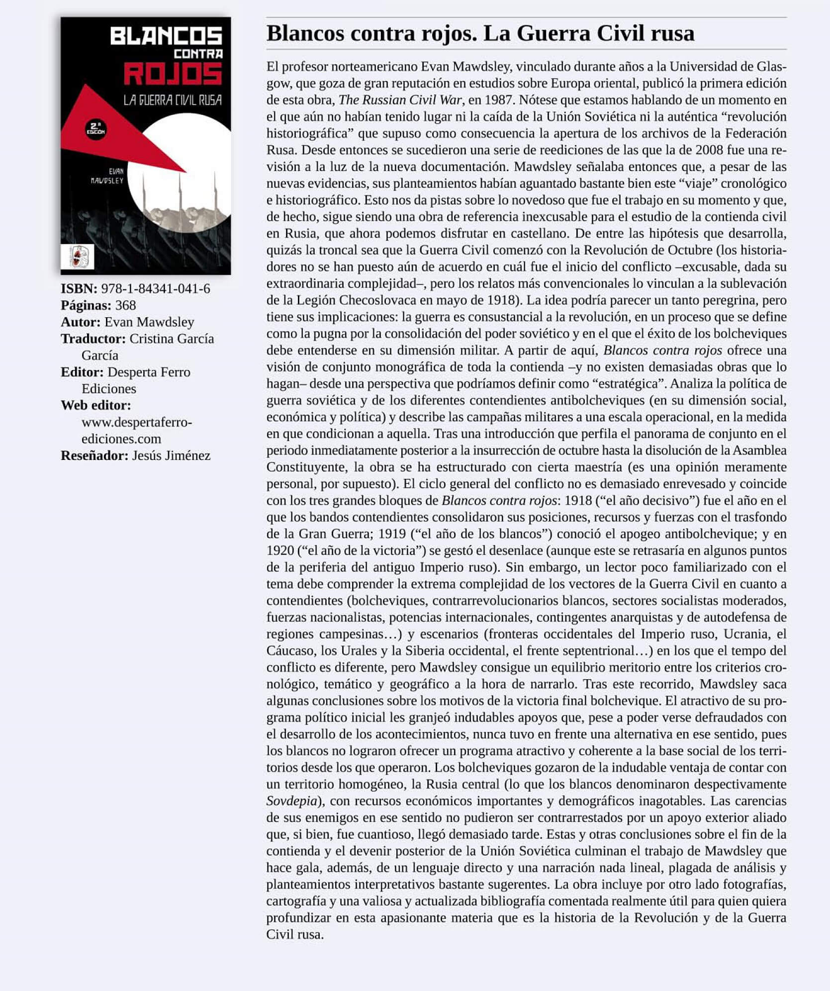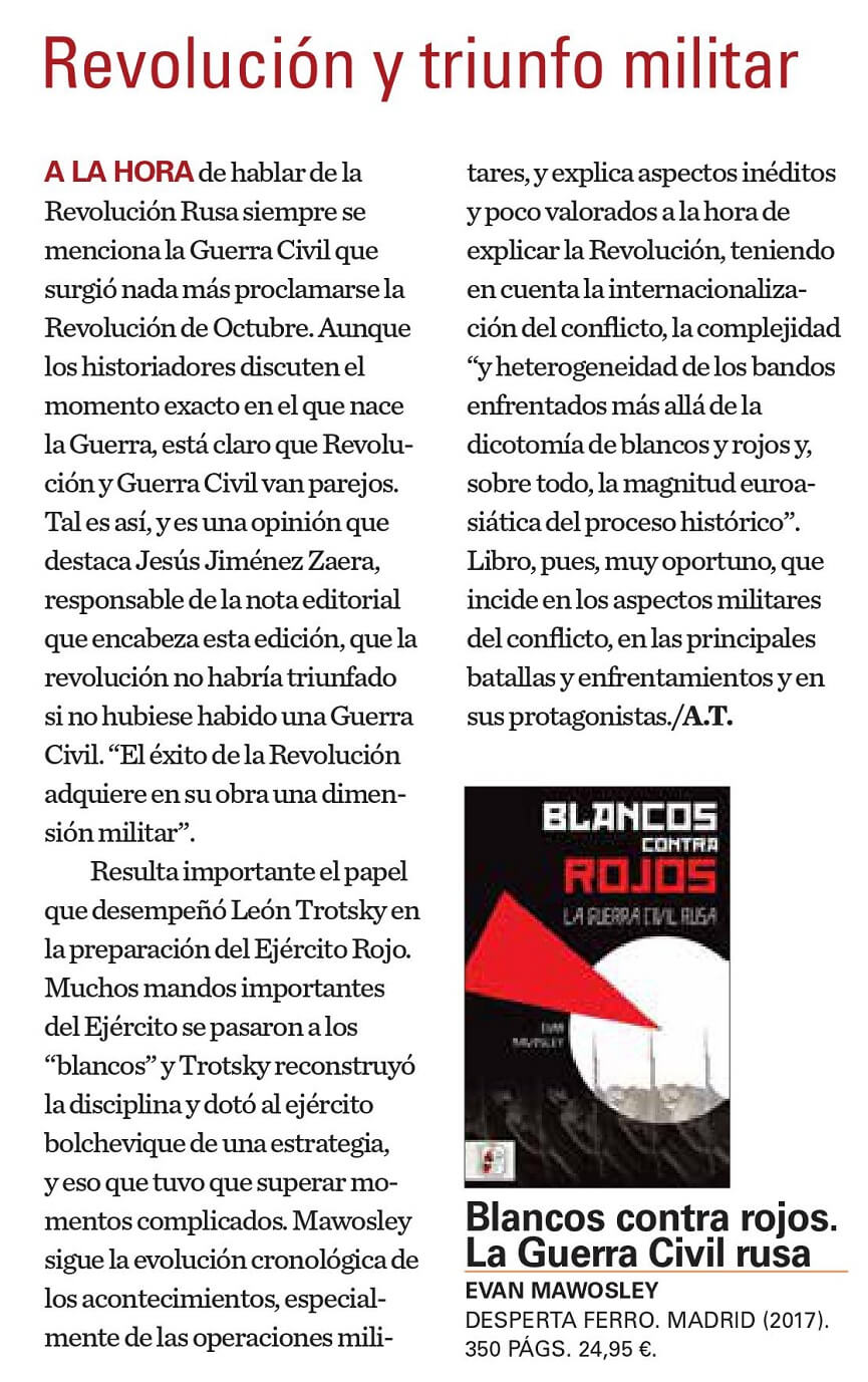 «…a descripción de los movimientos de tropas, los frentes, las formaciones de ejércitos, la conformación de núcleos blancos y rojos, los decisivos recursos, y un largo etcétera, lo encontraremos explicado muy pormenorizadamente en esta genial obra de Evan Mawdsley. Sin duda, un trabajo imprescindible para aquel que quiera conocer en profundidad la realidad de la Guerra Civil rusa entre 1917 y 1922».