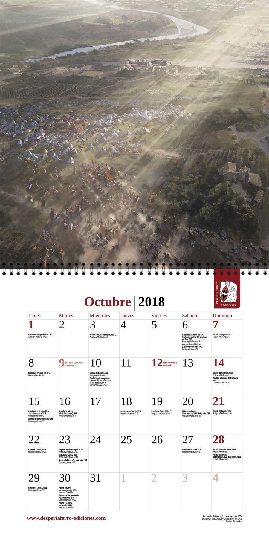 Desperta Ferro Ediciones te trae el calendario imprescindible para los apasionados de la Historia militar. En una edición limitada, y acompañado por una selección de las mejores ilustraciones históricas de nuestras revistas, con el Calendario 2018 podrás rememorar, día a día, las más trascendentales batallas de la historia.