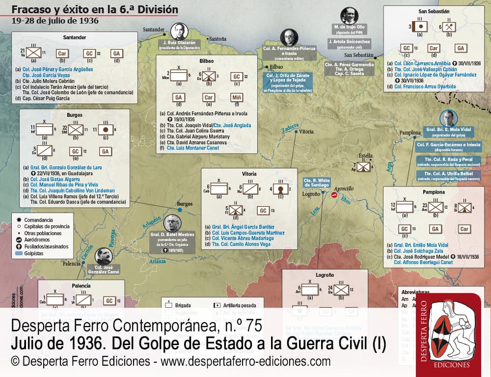 En la mañana del 19 de julio de 1936, el general Emilio Mola, comandante militar de Navarra, proclamó el estado de guerra en Pamplona. De los triunfos o fracasos de la sublevación en las guarniciones de la 6.ª División Orgánica dependería buena parte del éxito del golpe de estado cuyos preparativos tan trabajosamente había liderado. Justo tres meses antes, el 19 de abril de 1936, Mola había sido elegido por un grupo de oficiales de las guarniciones de Burgos, Estella, Logroño, Bilbao, San Sebastián y Pamplona como jefe de la conspiración militar contra el Gobierno de la República. Uno de los principales problemas a los que se enfrentaba era la carencia de una tropa fiable, por lo que se hacía imperativo llegar a un acuerdo con la Comunión Tradicionalista (CT), la principal fuerza política navarra, para que lo apoyara con su milicia, el Requeté. Para ello, comenzó una serie de contactos y negociaciones, que no fructificaron debido a las exigencias políticas de Manuel Fal Conde –jefe delegado de la Comunión Tradicionalista–.