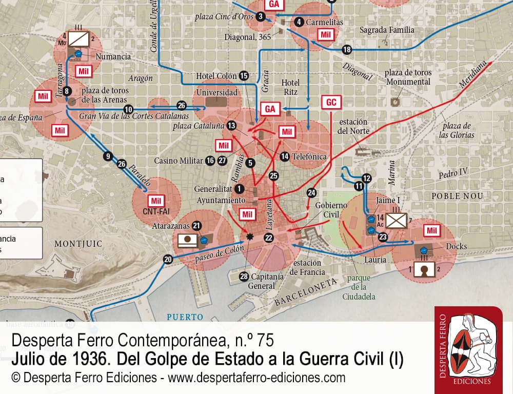 Barcelona ostentaba, a mediados de julio de 1936, el título de ciudad más poblada de España en una competencia cada vez más ajustada con Madrid. Una metrópoli abierta al Mediterráneo, industrial, llena de desigualdades, pero moderna y cosmopolita; y conocida por su combatividad obrera, en gran parte monopolizada por los anarcosindicalistas de la CNT -FAI. El Estatuto de autonomía catalán se había aprobado durante el primer bienio republicano, y en la ciudad se gozaba de unas cotas de autogobierno nunca vistas en los últimos doscientos años. Barcelona era también, desde el punto de vista de quienes conspiraban contra la Segunda República, una pieza clave. Era la cabecera de la 4.ª División Orgánica, que comprendía las cuatro provincias catalanas, contaba con una guarnición numerosa así como abundantes fuerzas de orden público –tres comandancias de la Guardia Civil, una de Carabineros y quince compañías de Seguridad y Asalto, además de los Mossos, numéricamente mucho menos relevantes– y dos bases de aviación. En la ciudad se situaban también los principales centros de poder civil de Cataluña, con la Presidencia de la Generalitat como elemento central.