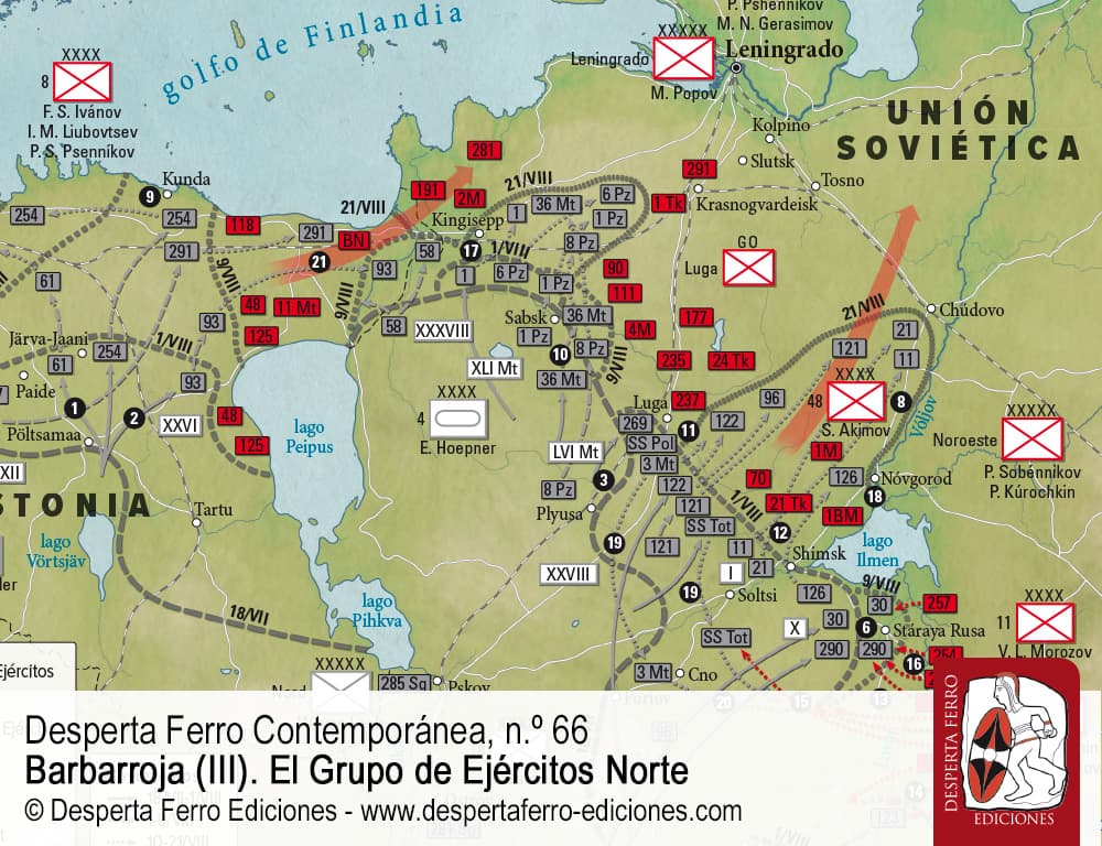 Tras la contundente derrota sufrida por el Ejército Rojo en sus fronteras durante la última semana de junio de 1941, nada más iniciarse la Operación Barbarroja, la destrucción de la Unión Soviética debía ser una mera cuestión de semanas, tal y como habían predicho los planificadores alemanes. Sin embargo, las cosas no iban a tardar en complicarse, sobre todo para el Grupo de Ejércitos Norte del general Von Leeb, cuyo objetivo era Leningrado. Infradotadas en carros de combate y en aviación de apoyo, al menos en comparación con el resto de las fuerzas alemanas, las tropas que se dirigían hacia la cuna de la Revolución tenían primero que derrotar al enemigo en Estonia y Letonia y en el territorio entre los lagos Peipus e Ilmen, enfrentándose a desafíos que a la postre iban a resultar insuperables. El progreso hacia el norte supuso un alargamiento de su flanco oriental que los soviéticos aprovecharon de inmediato para lanzar violentos contraataques, en los que localidades como Velikiye Luki o Staraya Russa adquirieron un protagonismo destacado; tuvieron que enfrentarse a un terreno infernal, boscoso y pantanoso, donde los carros de combate, su baza principal, se atascaban y tardaban en alcanzar sus objetivos; y además, Von Leeb fue incapaz de unificar sus dos cuerpos motorizados –donde se encuadraban las divisiones Panzer–, para formar una sola y contundente masa de ataque. A cambio de esto tenían dos bazas a su favor. La primera era el Ejército finlandés, que tenía que lanzar una ofensiva desde el norte pero que a la postre se limitó a recuperar el terreno perdido durante la Guerra de Invierno de 1940, por lo que su presión sobre Leningrado apenas alivió a las fuerzas alemanas, que no tardaron en verse envueltas en violentos combates para cruzar la línea del Luga. La segunda era el frente naval, donde la Flota Bandera Roja del Báltico tuvo que abandonar todas sus bases para concentrarse en Kronstadt y Leningrado, lo que al menos alivió la situación logística de los invasores. No iba a ser suficiente, sobre todo cuando el alto mando alemán se enfrascó en intensas discusiones sobre el objetivo último a alcanzar, retrasando toda la operación.