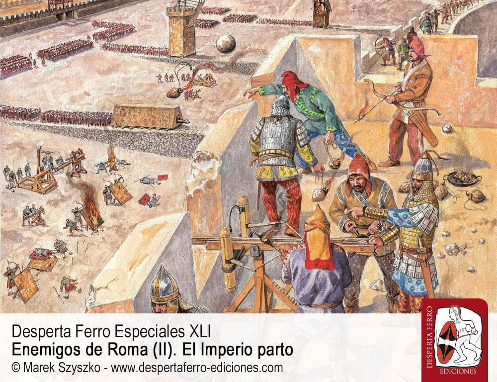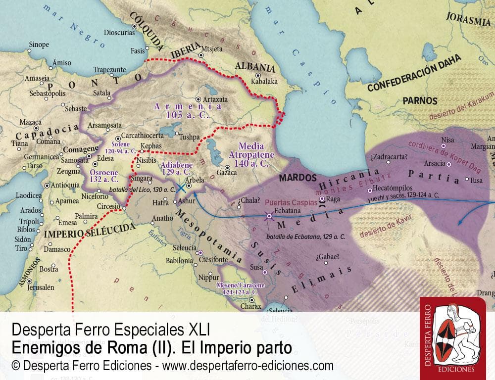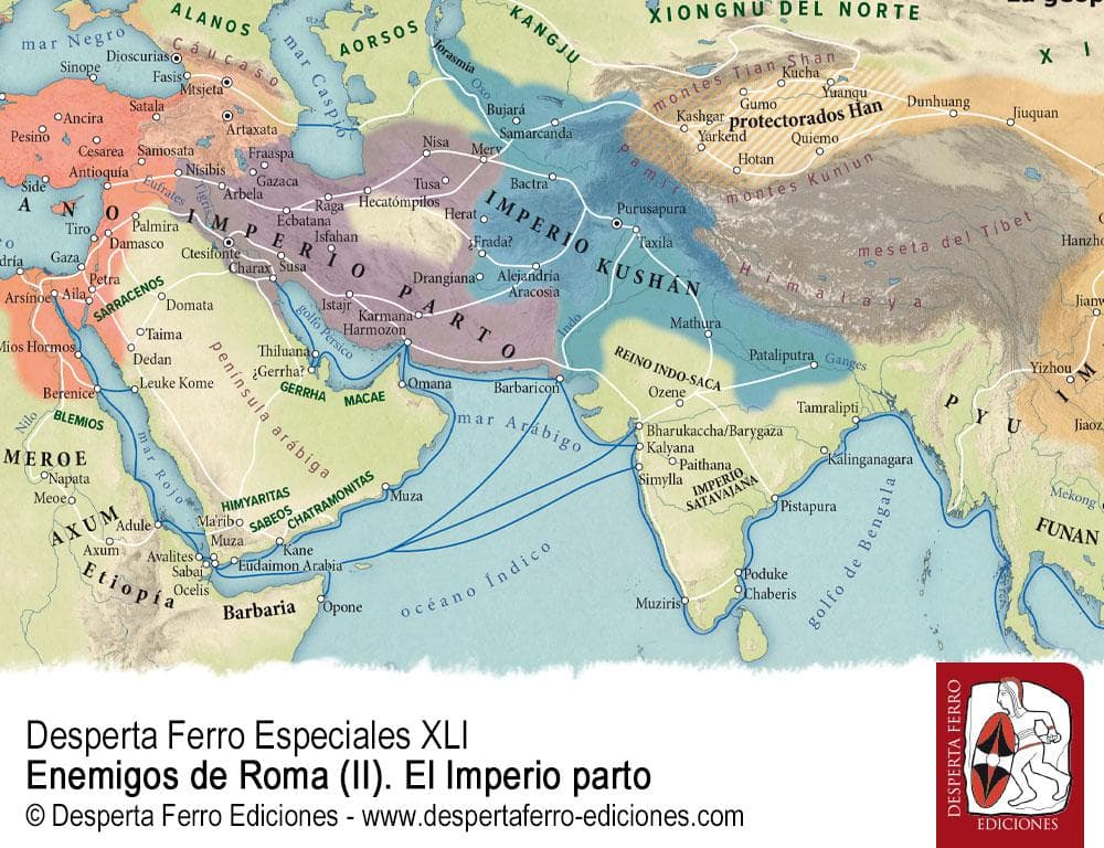 Desde el siglo I d. C. hasta su caída en manos de la dinastía sasánida, el Imperio parto se enzarzó en un prolongado duelo geoestratégico con el poder romano. Este estaba empeñado en desplazarle por entero de Armenia y Mesopotamia, a fin de poder extender, así, su dominio hasta el golfo Pérsico y, por lo tanto, sobre las lucrativas rutas comerciales –la Ruta de la Seda y las Especias, entre otras– que atravesaban toda la región y sobre las que los partos ejercían un férreo control. Con esta cuestión de fondo, los arsácidas hubieron de luchar por el estratégico dominio de Armenia y la alta Mesopotamia, no sin correr el riesgo de sufrir una temprana derrota total ya en tiempos de la invasión de Trajano (114-117 d. C.). A pesar de su denodada resistencia, Partia estaba perdiendo claramente la partida cuando los sasánidas aprovecharon el consecuente desprestigio arsácida para hacerse con el poder y tomar su lugar frente al tablero de juego geopolítico.