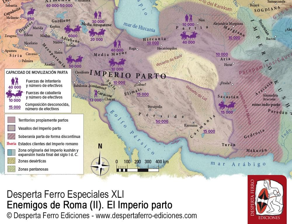 Salidos de las mismas estepas centroasiáticas donde encontrara Ciro II el Grande la muerte, descendientes de la misma estirpe que los verdugos del insigne gran rey, los partos heredaron un Irán aturdido y desestructurado, sometido a la dominación macedónica. De la mano de un inteligente empleo de la tradicional espina dorsal de los ejércitos esteparios –el arquero a caballo–, de la última innovación nacida en sus filas hacia el siglo V a. C. –el jinete catafracto– y guiados por la naciente dinastía arsácida, los partos lograron hacerse con el control de los dos tercios orientales del antiguo Imperio persa aqueménida. En el proceso, paulatinamente, se erigieron en legítimos herederos del mismo, a la par que supieron afianzar también las lealtades de sus ahora súbditos de origen heleno, a la par que las de los propios nativos. En su camino hacia occidente, en el siglo I a. C. el poder del Imperio parto tropezó con el de Roma, recientemente erigida en señora de Anatolia y el Levante. Tras un efímero entendimiento entre ambos titanes en expansión, el tiempo de la diplomacia degeneró rápidamente en un pulso geoestratégico permanente, salpicado de sucesivos baños de sangre y destinado a condicionar la trayectoria histórica del Imperio parto. Su monopolio estratégico sobre los ramales centrales de la Ruta de la Seda le convirtió en objetivo prioritario a batir por sus rivales, tanto en oriente como en occidente, impacientes todos ellos por hacerse con una parte de tan suculento pastel. Atrapados entre sus propios problemas dinásticos y la presión romana, los arsácidas iban a presentar una denodada resistencia durante más de dos siglos. Su poder acabó sucumbiendo, paradójicamente, a un golpe de Estado protagonizado por una nueva dinastía: los sasánidas. Fue mérito, sin embargo, de la hábil resiliencia para salvaguardar la tierra del gran rey, lista para continuar escribiendo innumerables páginas de su singular y épica historia.