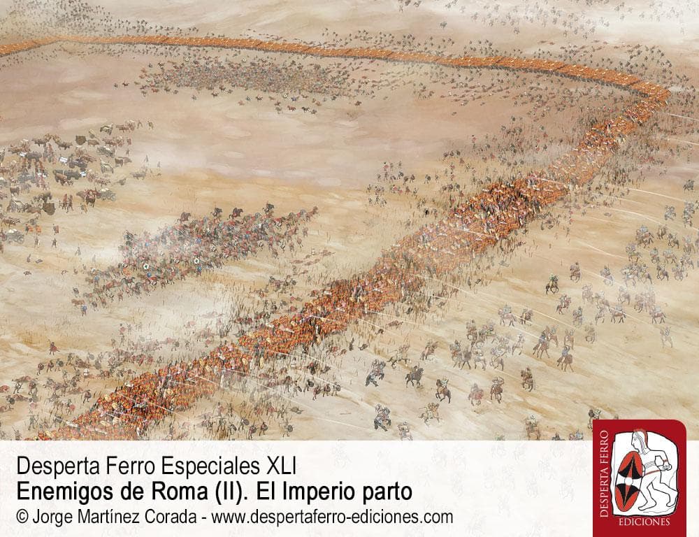 Un ejército marcha con lentitud por un territorio árido y calcinado por el sol, agobiado, sediento, desangrado paso a paso por nubes de proyectiles a los que apenas puede responder. Los tempranos intentos de romper la columna de marcha para cargar y enfrentarse cuerpo a cuerpo a unos torturadores apenas visibles en la distancia son siempre fracasos, y acaban en agotamiento y muerte. La desesperación se va adueñando de las tropas. Con el paso de las horas, incluso los más fuertes ceden. Es entonces cuando los hasta entonces elusivos y ágiles enemigos se aproximan para la carnicería: muchos se entregan sin resistencia a la esclavitud o la degollina; algunos buscan un altozano, o una roca, pera vender caras unas vidas que saben se acaban. Es esta una historia militar intemporal en lo esencial, muchas veces repetida, con variantes de detalle. Y así ocurrió también en las llanuras polvorientas de Carrhae o Carras, en la actual Siria, avanzada la primavera del año 53 a. C.
