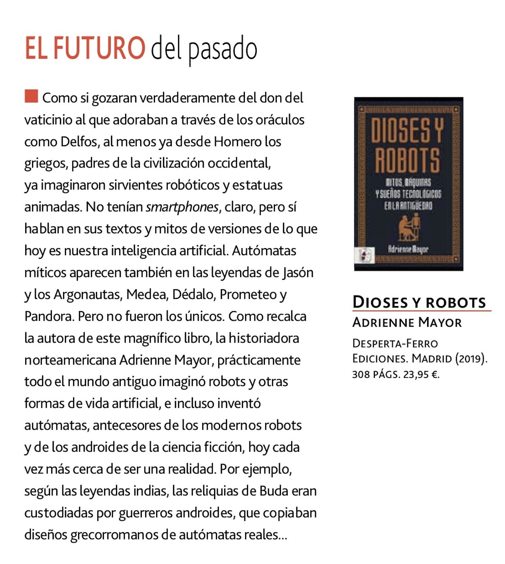 «Los mitos están jalonados de esta pugna entre el orden divino y el impulso de progreso. Sus protagonistas se debaten en un reto eterno que todavía hoy, en pleno siglo XXI, se nos plantea, ahora en forma de dilema ético, a la hora de abordar determinados avances tecnológicos. De ello trata el formidable libro de Adrienne Mayor Dioses y robots. Mitos, máquinas y sueños tecnológicos en la Antigüedad, editado en castellano por Desperta Ferro en este 2019, una obra que va mucho más allá de lo que parece prometer su título, para sumergirnos en ese fabuloso mundo en el que el mito adquiere una vigencia universal por abordar nuestra complicada naturaleza humana».