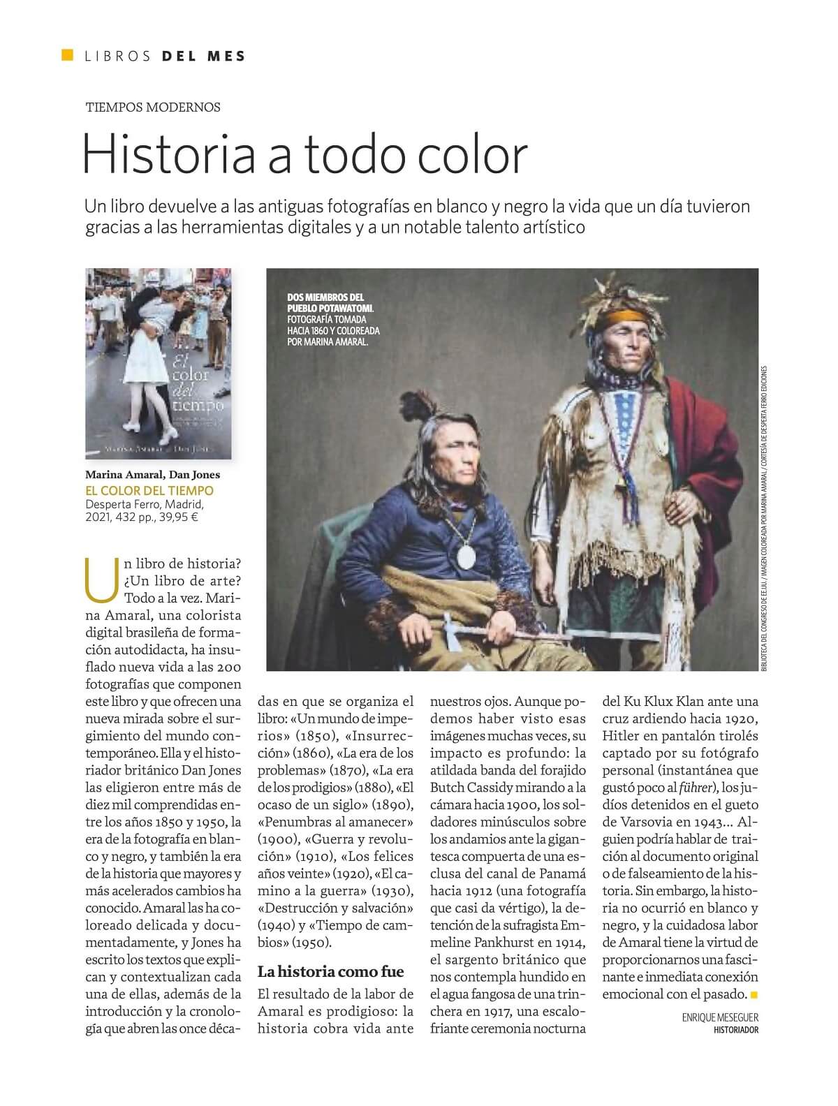 «El color del tiempo (Desperta Ferro), que reúne doscientas fotografías desde 1850 hasta 1960 […] se convierte, de esta manera, en una suerte de enciclopedia visual de los hitos más importantes de la historia. Desde la reconstrucción de París hasta la carrera espacial. En medio queda todo un mundo que nos había llegado solo en blanco y negro. Pero como aseguró el astronauta Yuri Gagarin al contemplar la Tierra: «Es azul. Qué maravilla. Es asombroso»».