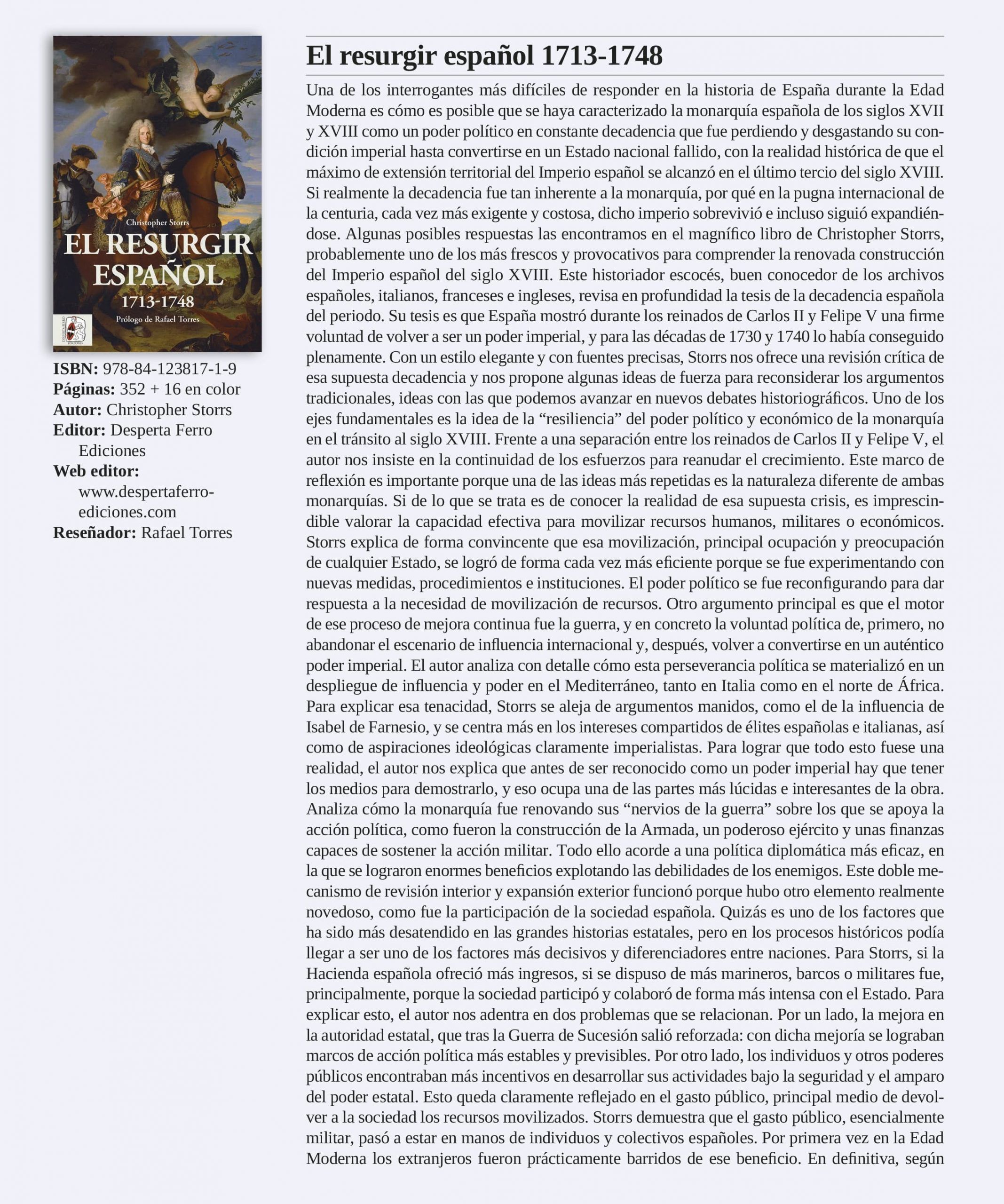 «La obra de referencia del hispanista Christopher Storrs, donde prueba que la Monarquía Hispánica reivindicó un lugar privilegiado entre las grandes potencias europeas de la primera mitad del siglo XVIII y derriba el mito de la decadencia endémica».