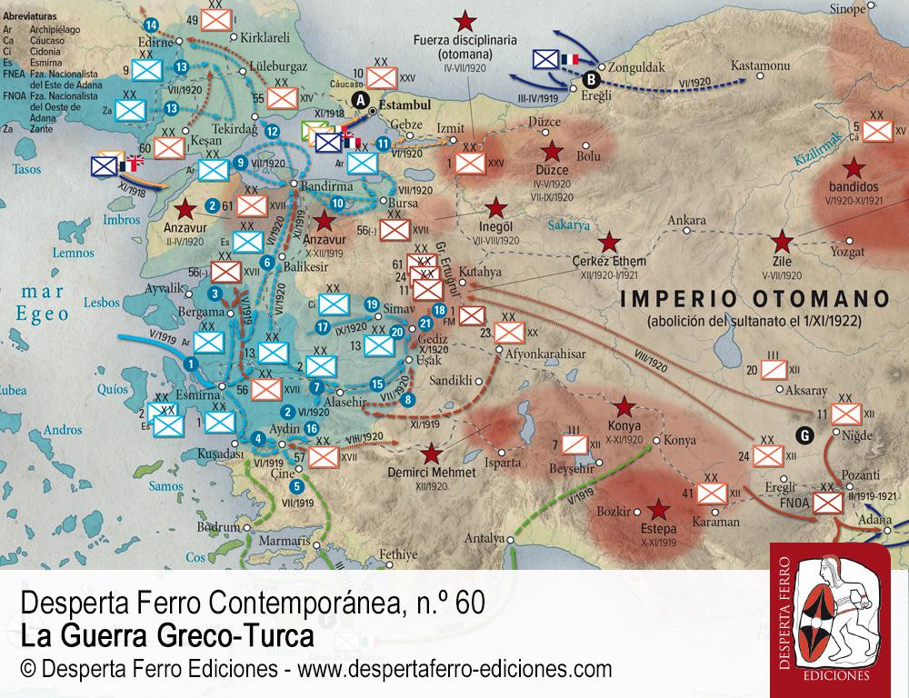 Al final de la Primera Guerra Mundial, el Imperio otomano, que había sido la potencia dominante en el Mediterráneo oriental durante siglos, llegó al final de su proceso de decadencia. El antaño poderoso enemigo de los Austrias había quedado destrozado y a la espera del veredicto de los vencedores, reunidos en París. Enfrente estaba Grecia, un Estado nacido de la Guerra de la Independencia de 1821 contra esos mismos otomanos y que, desde entonces, había ido creciendo hasta convertirse en una potencia local, pequeña en tamaño pero inmensa en ambiciones pues no pretendía otra cosa que la llamada Megali Idea, la Gran Idea, que consistía en reunir a todos los griegos de la región del Egeo-mar Negro en un solo país. El 15 de mayo de 1919, la 1.ª División griega desembarcó en İzmir, la antigua Esmirna, para asegurar la posesión de aquella ciudad clave en su proyecto expansionista, iniciando una guerra que iba a durar más de tres años, que sería testigo de grandes maniobras por toda la mitad occidental de Anatolia, cuyo vuelco se produciría sobre un río llamado Sakarya a tan solo cincuenta kilómetros de Ankara y que acabaría con la derrota completa de Atenas y la expulsión definitiva de todos los helenos, militares y civiles, de la región, pero no a manos del Imperio otomano. Este, abrumado por las durísimas condiciones del Tratado de Sèvres fue cediendo poco a poco su lugar al pujante movimiento nacionalista nacido en Ankara y liderado por Mustafá Kemal (Atatürk), que acabaría derrocando al sultán y proclamando el nacimiento de la República de Turquía.