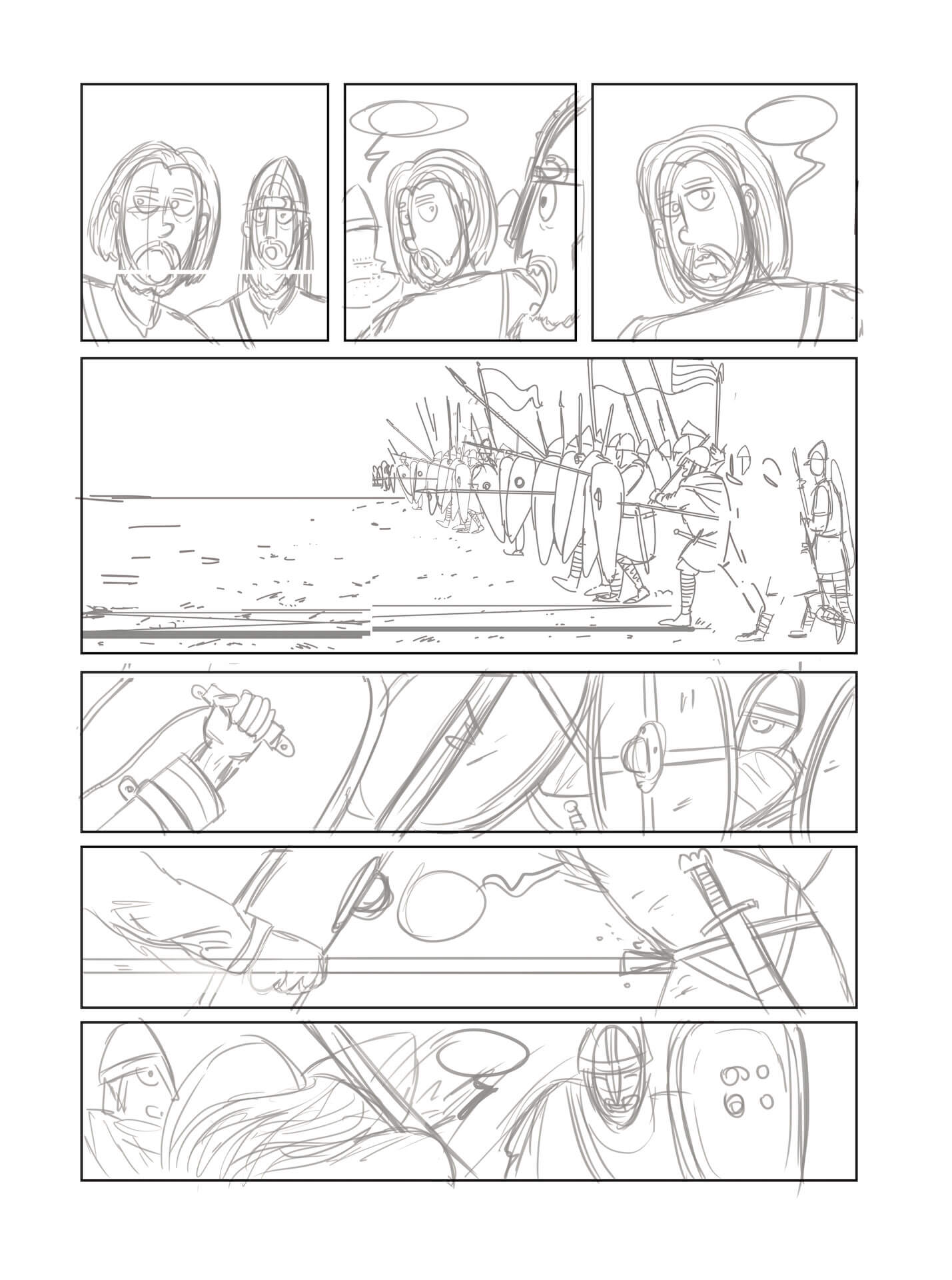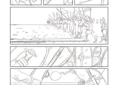 Cada página de Historietas implica un proceso muy cuidado. En primer lugar, El Fisgón Histórico (Juan de Aragón) y Alberto Pérez se reúnen para, a partir del guión, concebir cada página, decidiendo qué mostrar en las viñetas. A partir de ahí entra el genio del Fisgón, que hace una primera aproximación en lápiz (aquí le tienes trabajando en el próximo título de la colección, a ver si adivináis sobre qué personaje versará), que servirá de base para el boceto digital. Este se va puliendo y acaba en un limpio dibujo, donde ya se aprecian los detalles de rostros, objetos o paisajes de Harald, el último vikingo.