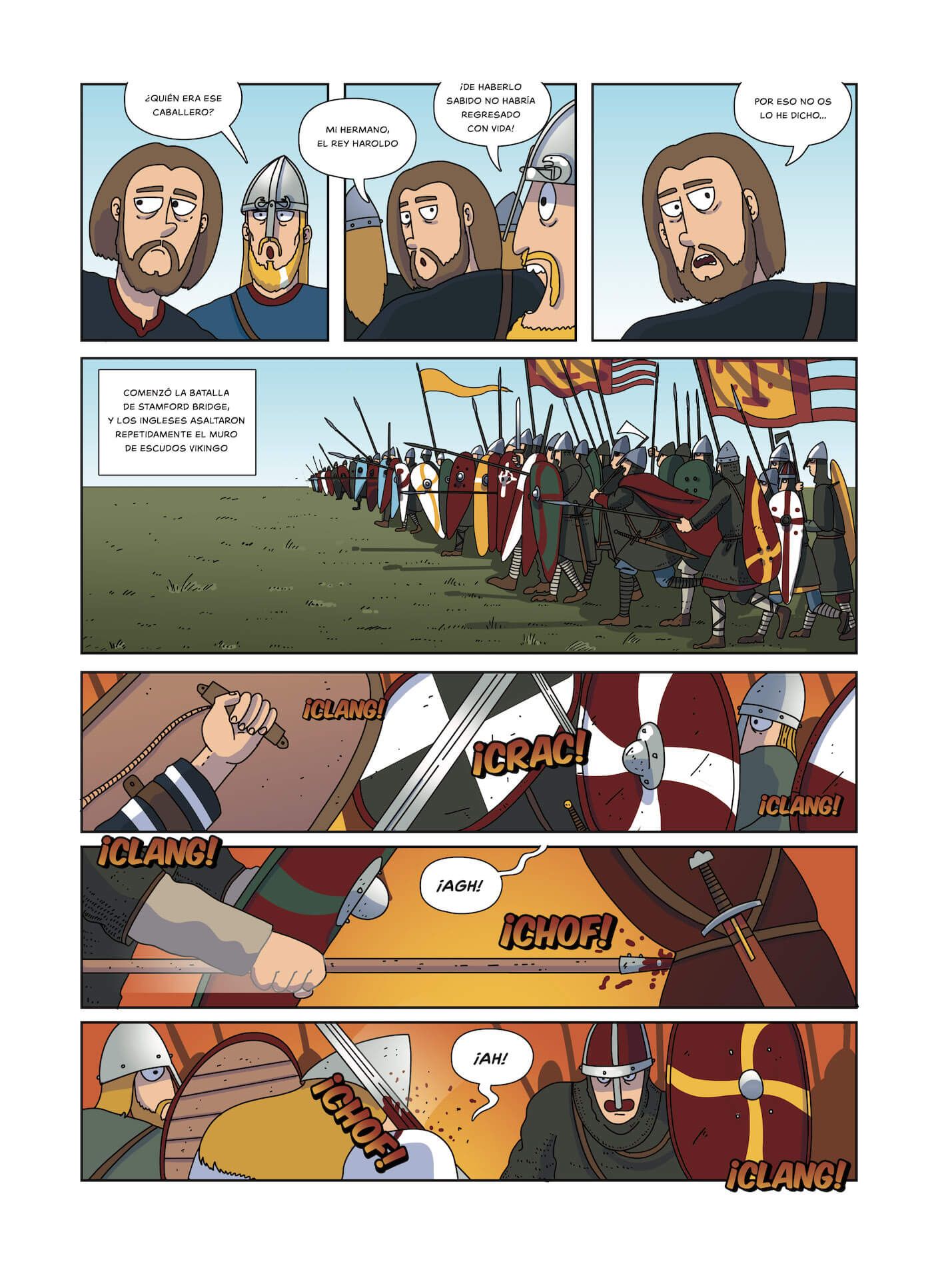 Y aquí no hay que destacar solo la fidelidad de los detalles al registro arqueológico e iconográfico, sino la fuerza que Juan da a los personajes, con gestos y posturas a cual más expresivo, y que nos permite empatizar con ellos. A esto le sumamos el coloreado, con esa paleta suya tan característica que otorga una vivacidad brutal a las escenas. Por último, se rotula, para dar voz a cada vikingo, conquistador español o reina egipcia que salga del pincel (¡digital!) de El Fisgón Histórico.