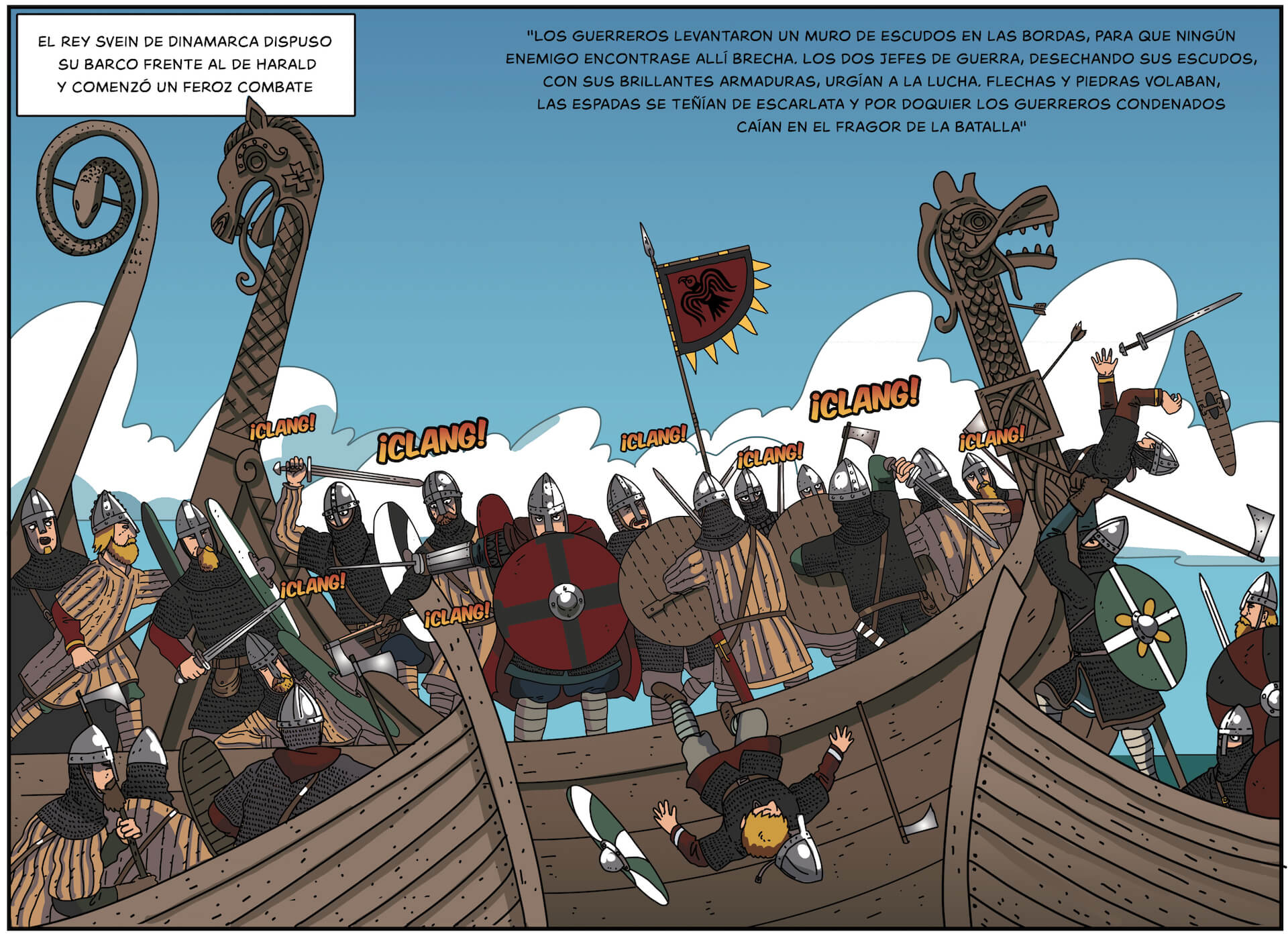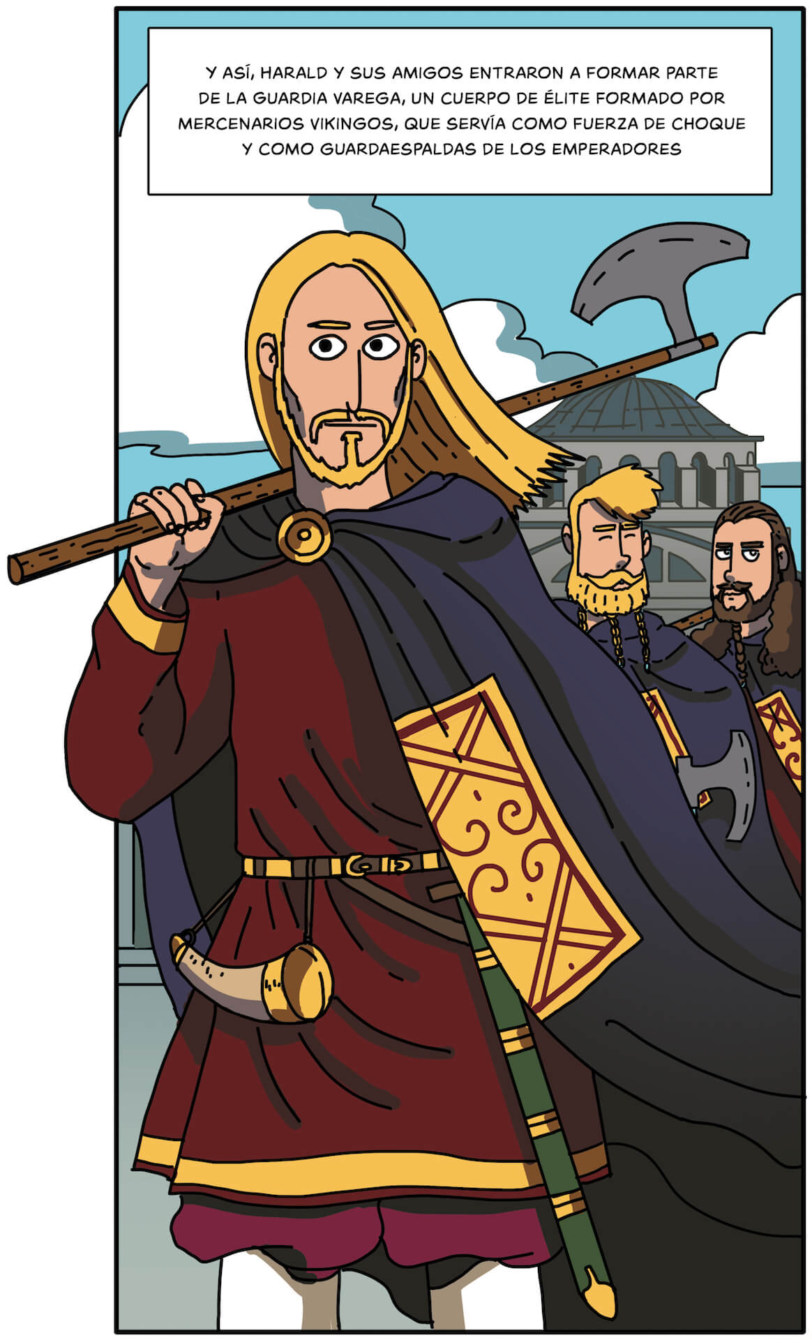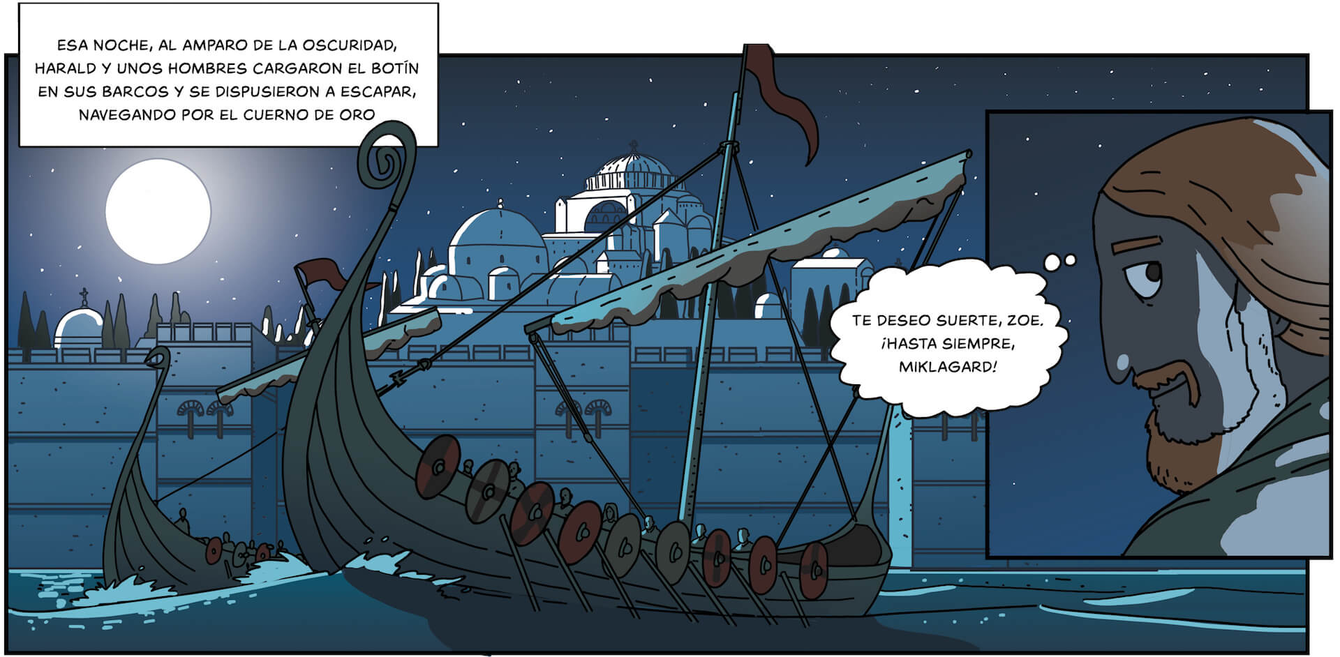 Si de algo nos preciamos en Desperta Ferro es de la fidelidad de nuestras ilustraciones a la realidad histórica, y eso es algo que hemos mantenido en la colección Historietas. Combinamos un trabajo de documentación exhaustivo con el entusiasmo por la historia y su representación de Juan de Aragón, El Fisgón Histórico. Para recrear el aspecto de los personajes y de los lugares por donde transcurre la acción de Harald, el último vikingo nos apoyamos en lo que sabemos por la arqueología, muy bien trabajada en Escandinavia para la Era Vikinga, y por la iconografía, con ejemplos como el famoso tapiz de Bayeaux. Puedes estar seguro de que las armas y vestimentas, las casas y palacios, o los barcos y ejércitos, se corresponden a lo que sabemos de la época. Y todo ello con el característico estilo de El Fisgón Histórico, colorista y vivaz, expresivo pero detallista, y capaz de viñetas tan increíbles como esta de la huida de Harald de Constantinopla, con Santa Sofía recortada en la noche.