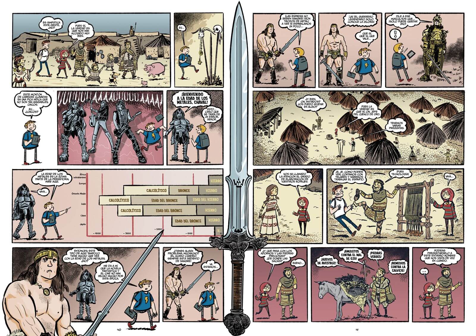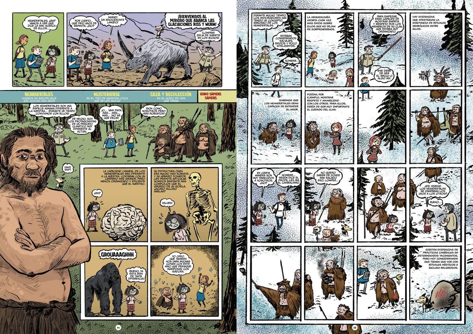 Entre volumen y volumen de Historia del Arte en cómic, Pedro Cifuentes pone a sus agentes de la historieta a transitar por su Historia de España en cómic, en una nueva colección que promete ser rompedora. En primer lugar, rompedora en lo formal, porque nos liamos la manta a la cabeza y nos vamos a un formato enorme, a libros de 29,7 x 42 cm de tamaño, quizá no lo más cómodo para leer en la cama, pero sin duda inmejorables para deleitarnos con los mil y un detalles que tienen las ilustraciones de Pedro. Y rompedora también en contenido, porque cada volumen de la colección contará con la asesoría de investigadores expertos en el tema en cuestión, para reflejar una historia que huya de apolillados discursos positivistas, de reyes y batallas, y que explique los procesos de fondo y otorgue su parte a los individuos habitualmente olvidados y olvidadas por la historia: la mujer, la infancia, los subalternos, los excluidos… Este primer volumen de Historia de España en cómic estará dedicado a la Prehistoria, desde la hominización a la Edad de Bronce, y entreteje el discurso cronológico con la explicación de los procesos de cambio que acontecen a lo largo de tantos milenios, para responder a cuestiones como qué es lo que nos hace humanos, el nacimiento del pensamiento simbólico, el origen y expansión de los mitos, la aparición de las desigualdades y las jerarquías, etc. Los principales yacimientos de nuestro país –de Atapuerca y Altamira al Argar o los Millares– y las piezas arqueológicas más destacadas se ponen de relieve, pero también nos asomaremos a un laboratorio y al trabajo científico para entender las técnicas que nos permiten conocer, cada vez mejor, la vida en la Prehistoria. Mamuts y osos de las cavernas, neandertales y Sapiens Sapiens, pinturas rupestres y megalitos…¡en un cómic que marcará época!