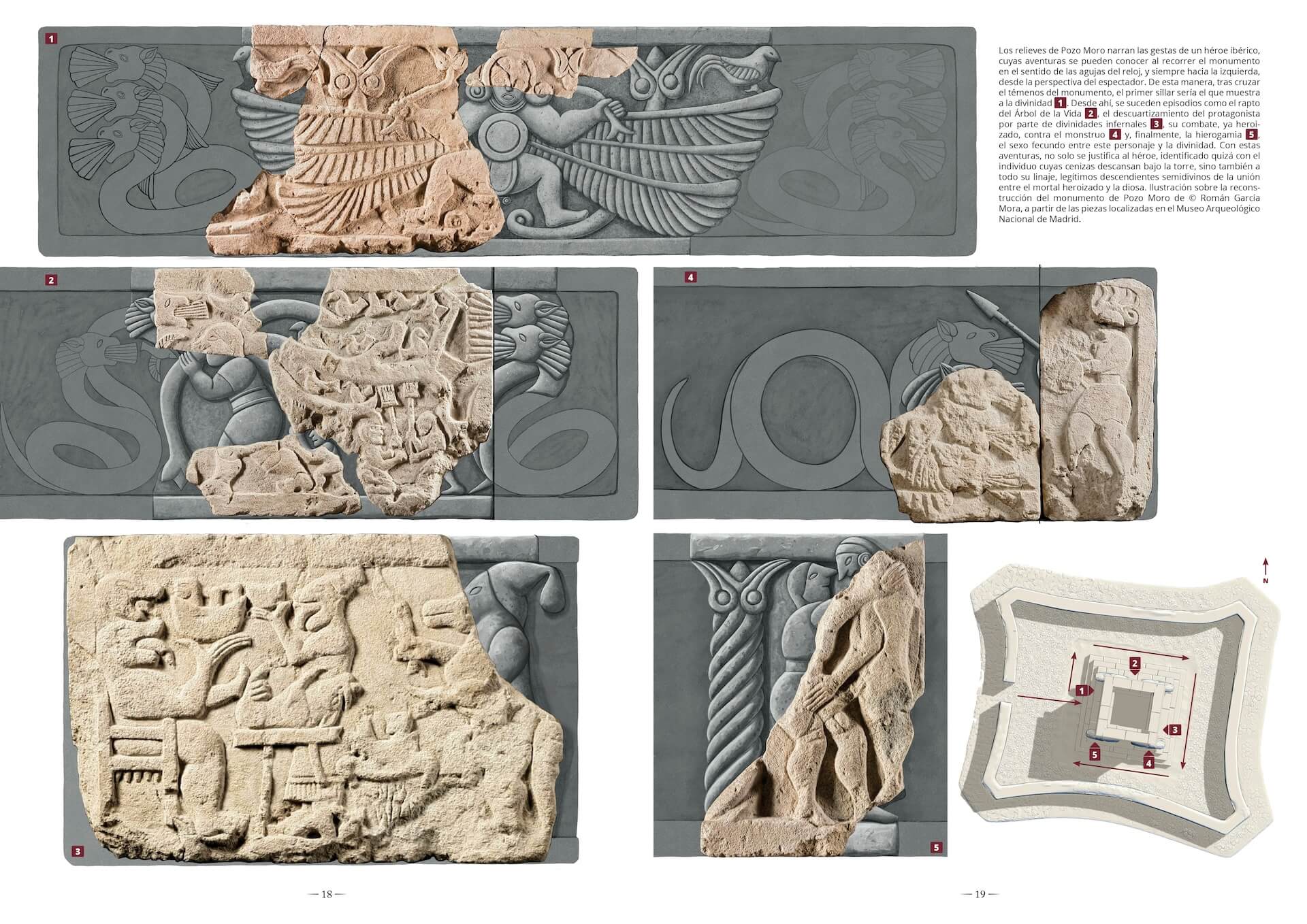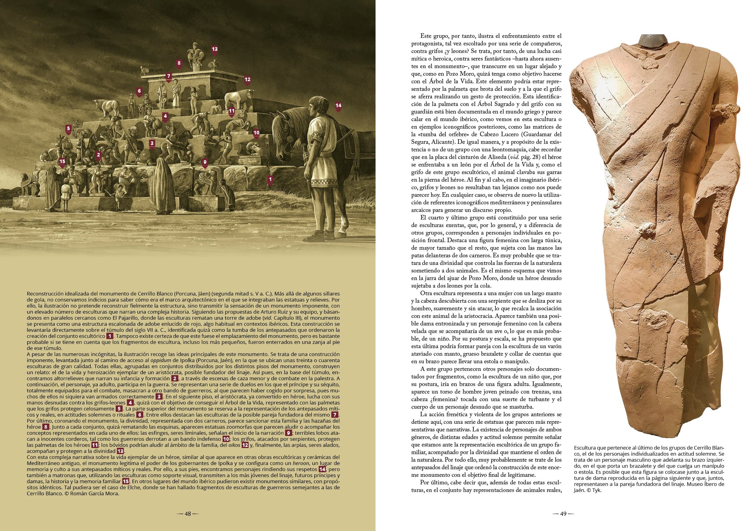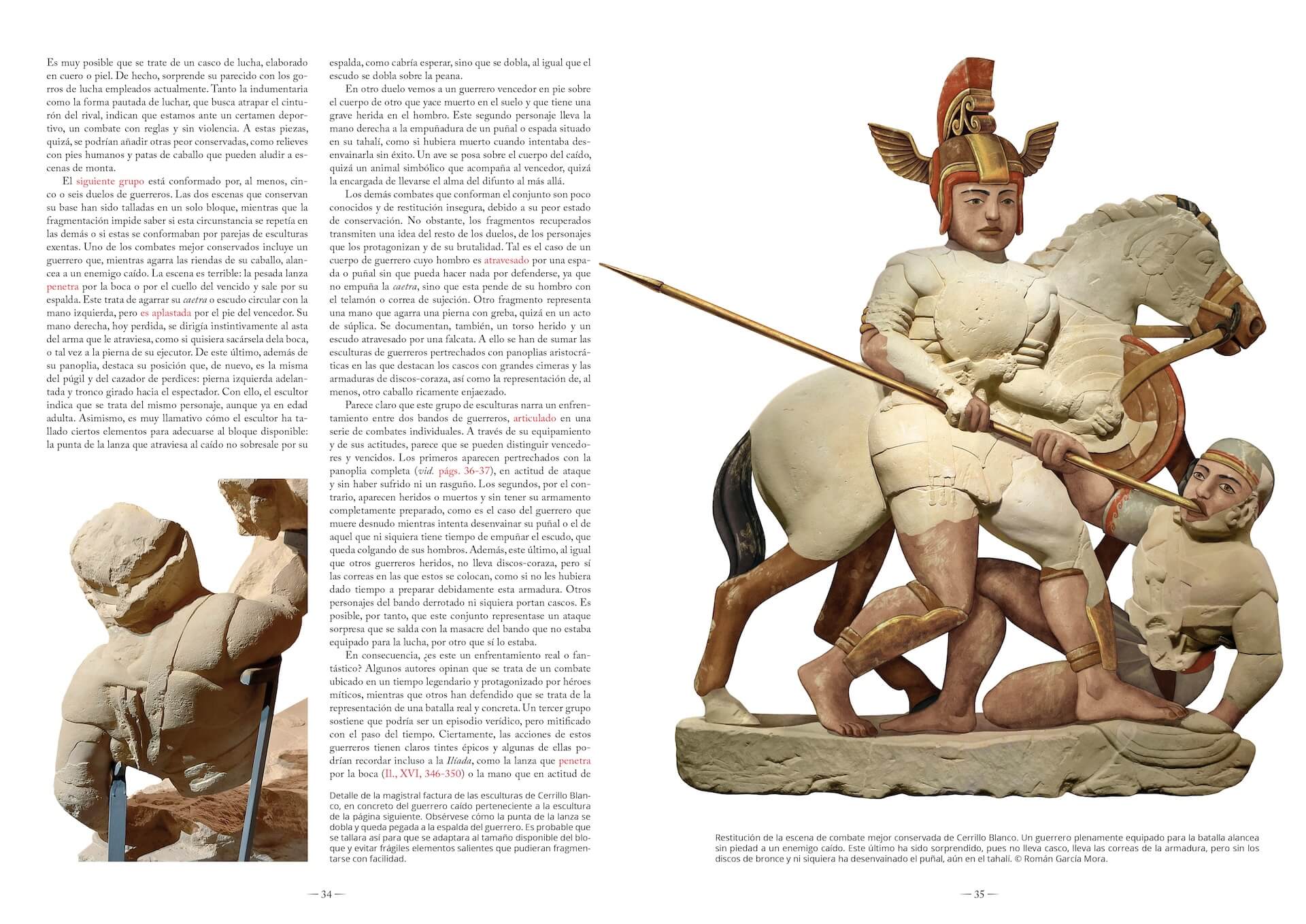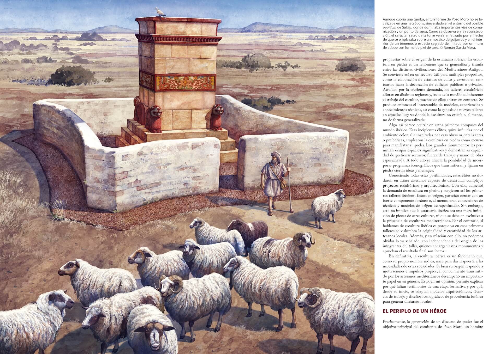 Damas pétreas de sonrisa enigmática, guerreros que empuñan falcatas en un combate eterno y rugientes leones, todavía terribles pese a su inmovilidad milenaria. Todos ellos evocan un mundo, el de los antiguos íberos, desaparecido hace siglos pero que sigue fascinándonos. Un mundo que este maravilloso libro ilustrado recorre desde su origen en el siglo V a. C. hasta su lenta desaparición en el cambio de era, tras la conquista romana. Y lo hace a partir de la manifestación cultural más señera de los íberos, su escultura, que ya enamorase a Picasso, y que sirve a Jesús Robles Moreno como hilo conductor para recorrer en Damas, torres y leones. Los íberos a través de su escultura la historia del pueblo que habitó la franja mediterránea de la península ibérica. Desde los grandes monumentos como la torre de Pozo Moro o el fabuloso conjunto heroico de Cerrillo Blanco hasta efigies tan emblemáticas como las damas de Elche o Baza, pasando por las esfinges y grifos que custodiaban las necrópolis, la escultura ibérica sirve para entender la sociedad ibérica y sus transformaciones, pero también para conocer su religión y sus mitos, sus valores y sus anhelos, su origen y su final. En diálogo con el texto, un aparato visual deslumbrante, con abundante fotografía pero, sobre todo, con reconstrucciones documentadas e ilustradas con esmero, al detalle. A través de ellas, se consigue sacar a esas piezas del hieratismo de la sala de un museo para que vuelvan a vibrar con sus colores originales y en los emplazamientos que las cobijaron, desde el trabajo en un taller a su dedicación en un santuario. Porque la escultura ibérica es piedra, pero dista de estar inerte, y, reviviéndola, reviven los íberos.