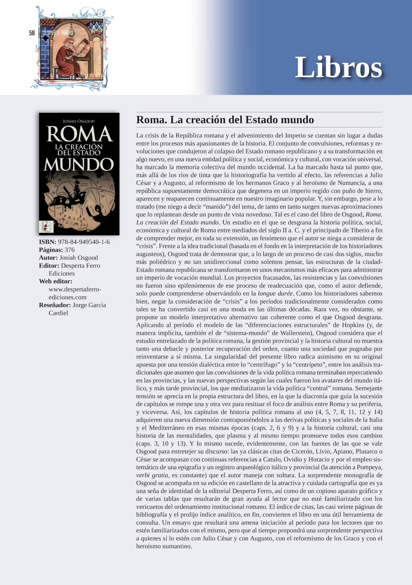 «Esta es la última novedad de la editorial Desperta ferro ediciones, un ensayo escrito por Josiah Osgood, que recorre la historia de Roma desde mitad del siglo II a. C hasta la muerte de Augusto en 14 d. C. Es un libro relativamente corto, de poco más de 300 páginas, escrito de forma amena, algo que hace que sea entretenido y muy fácil de leer».