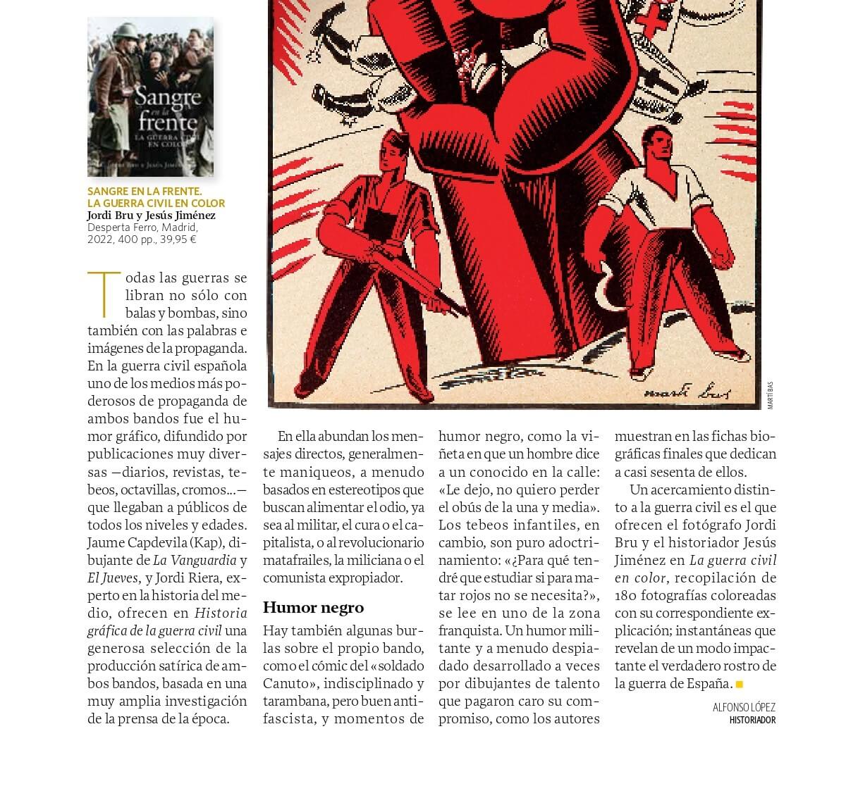 «Un acercamiento distinto a la guerra civil es el que ofrecen el fotógrafo Jordi Bru y el historiador Jesús Jiménez en Sangre en la frente. La Guerra Civil en color; recopilación de 180 fotografías coloreadas con su correspondiente explicación; instantáneas que revelan de un modo impactante el verdadero rostro de la guerra de España».
