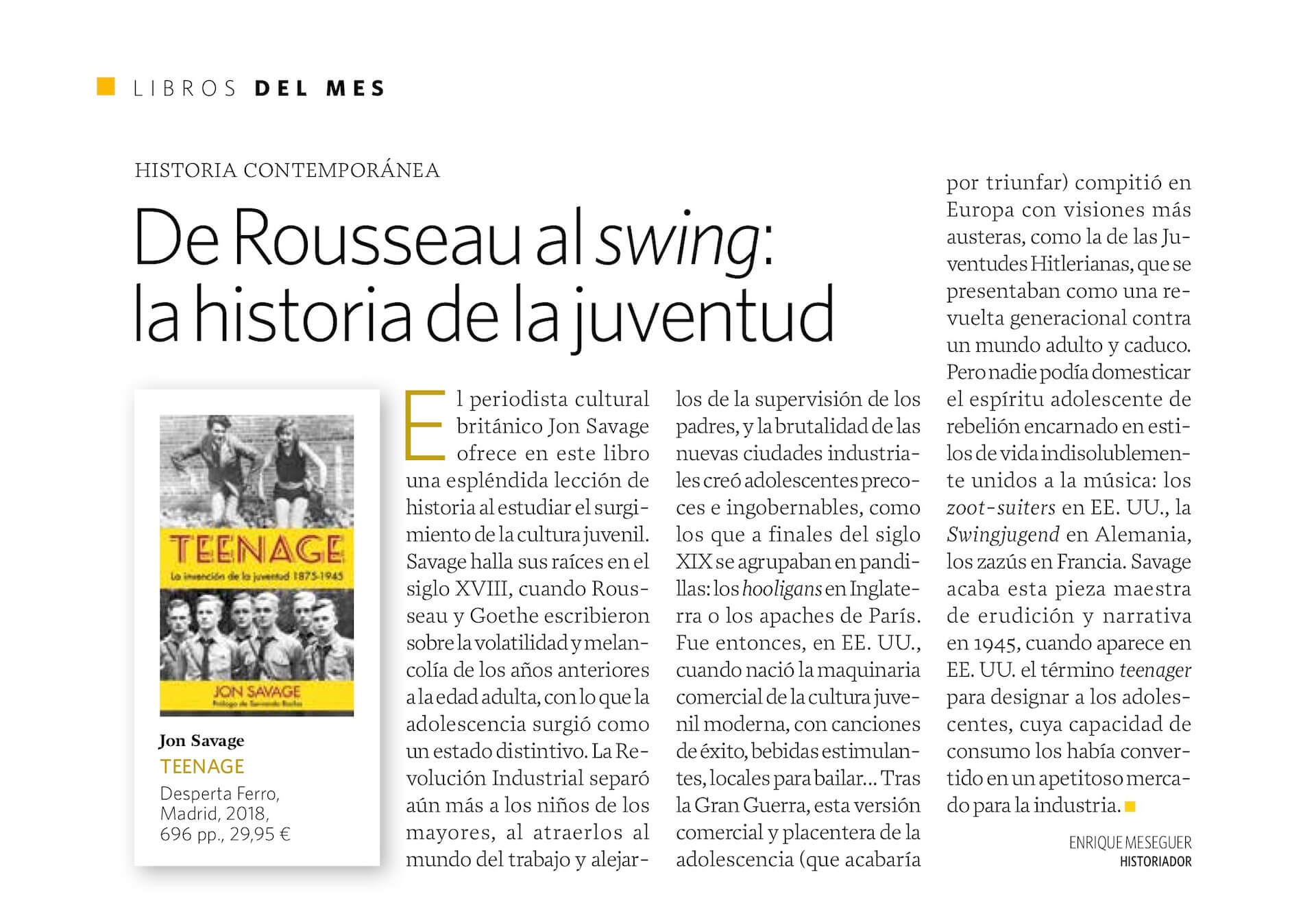«La línea que une los puntos lleva hasta Teenage, de Jon Savage (editado por Desperta Ferro), un ensayo monumental que cuenta el nacimiento de la idea de juventud y su desarrollo desde 1875 hasta 1945. O sea: antes de la televisión y del rock, los hitos a los que asociamos siempre la plenitud de la cultura juvenil».